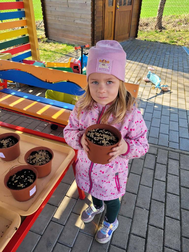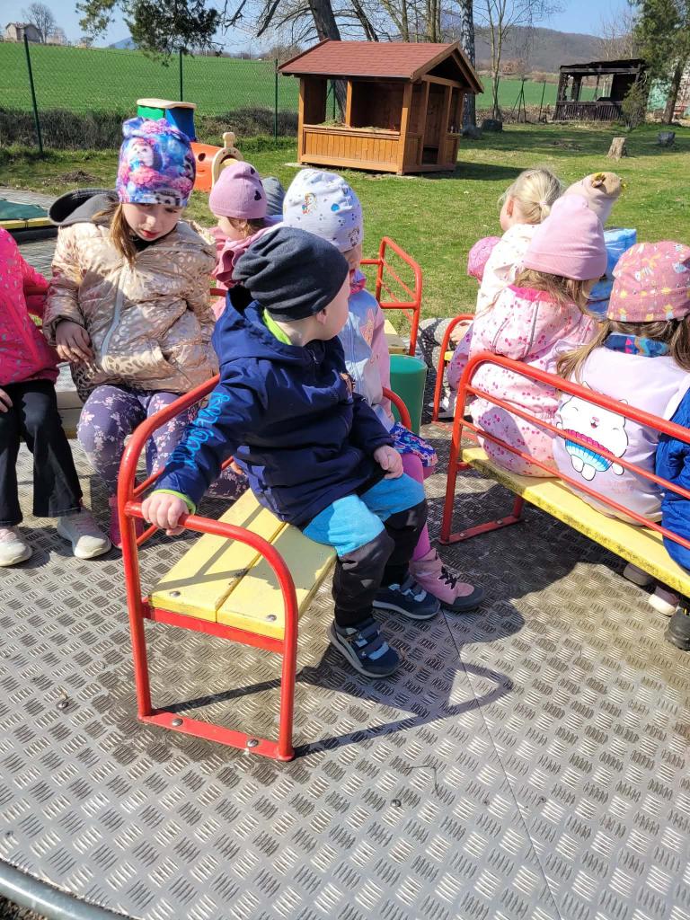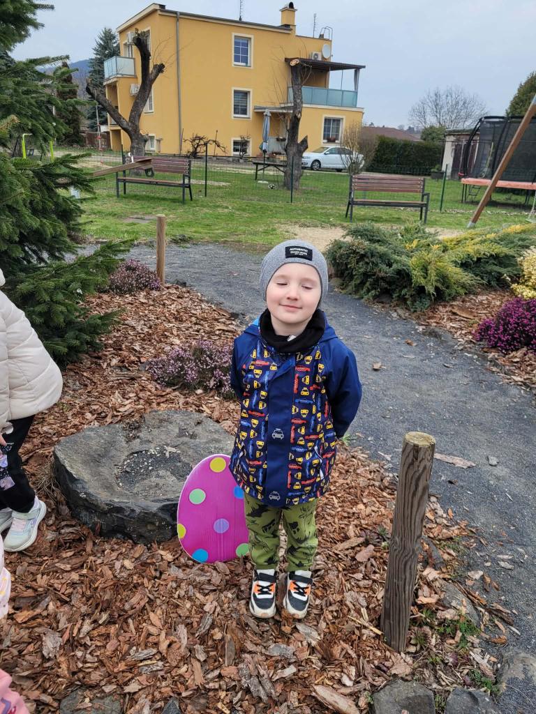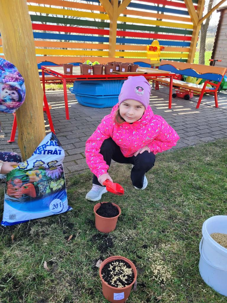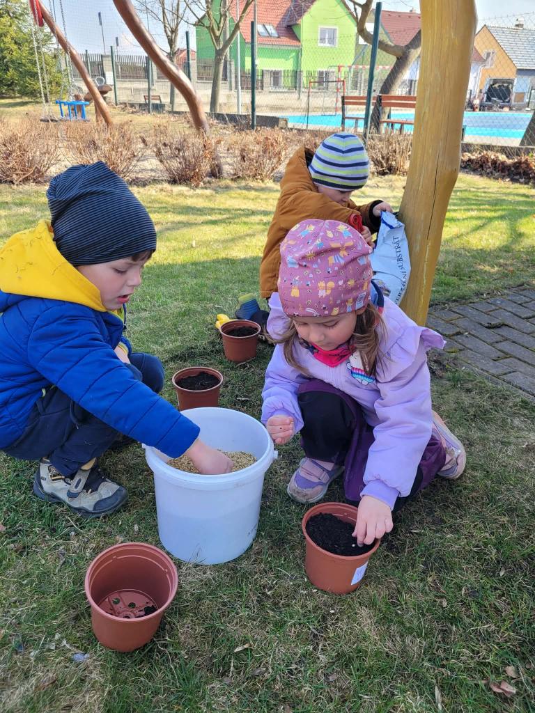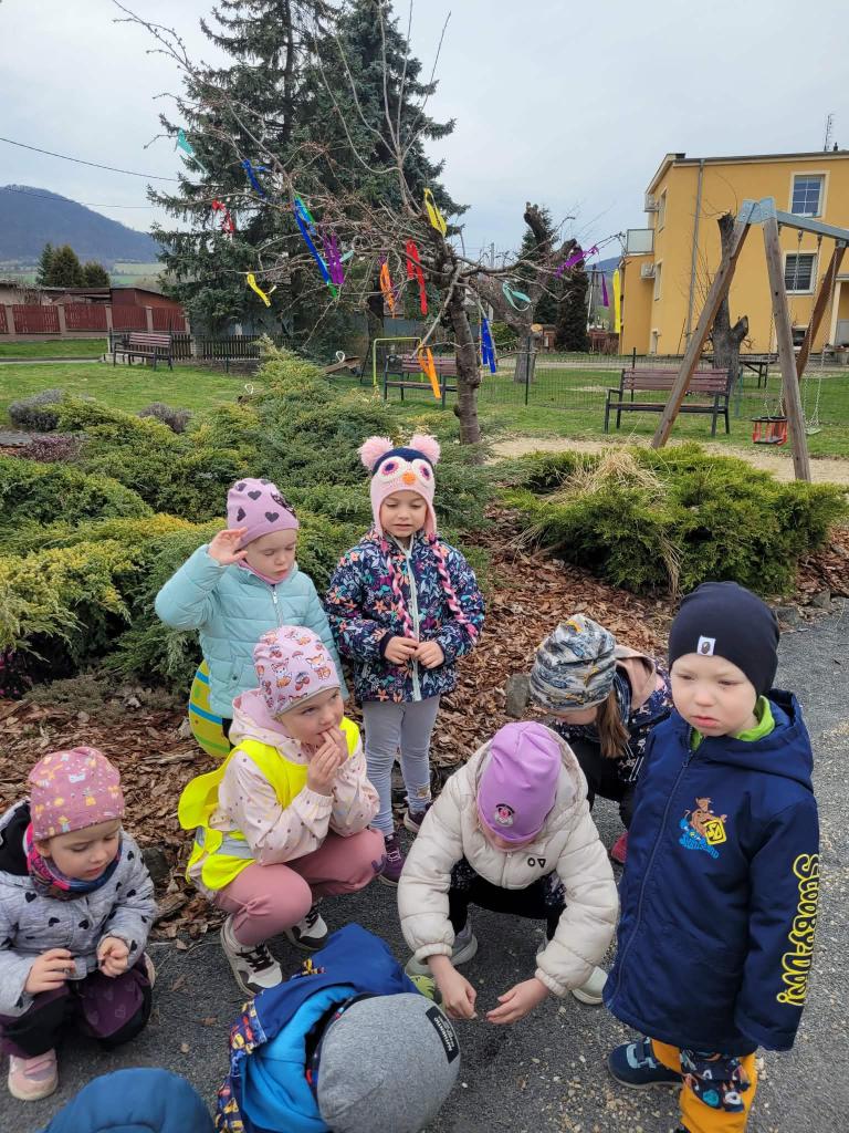 Děti si s radostí vysévají osení, poznávají jarní přírodu na vycházkách, hrají si na zahradě mateřské školy a všímají si velikonoční výzdoby v obci.