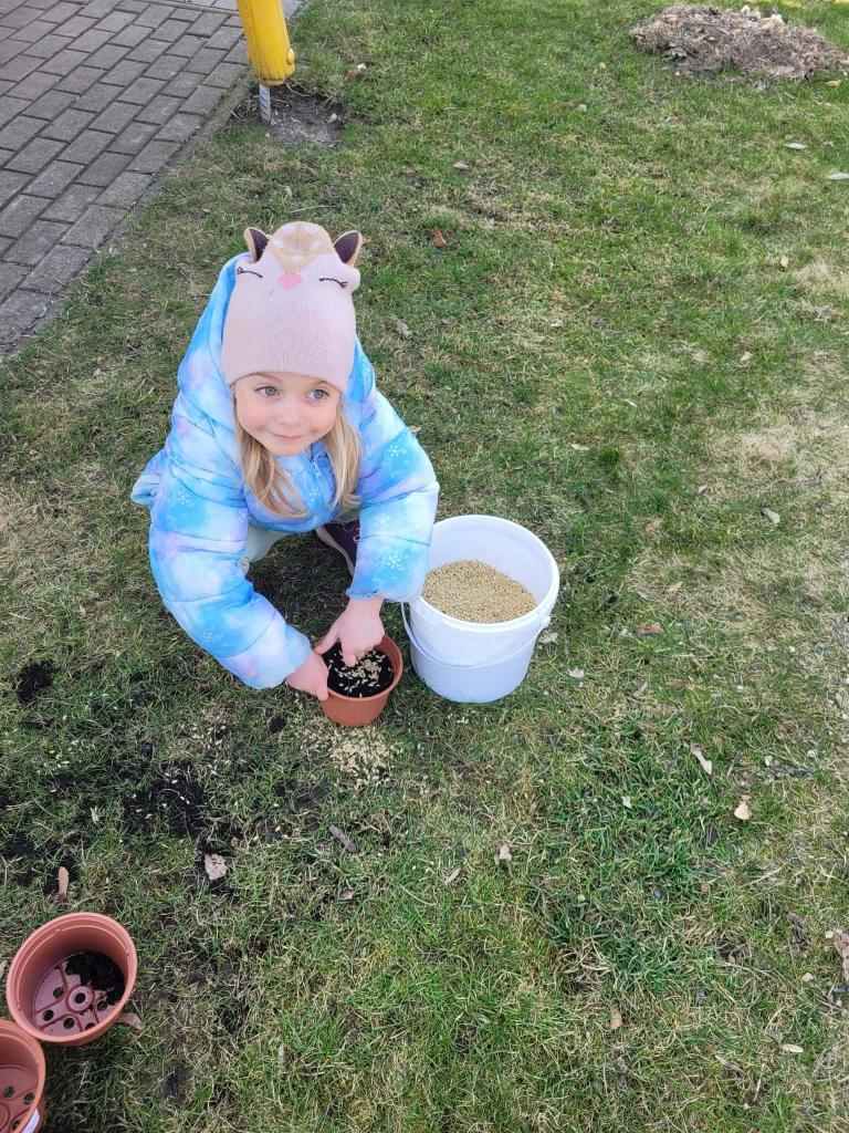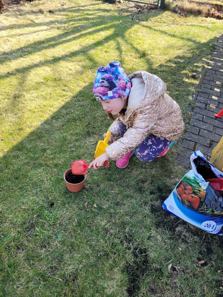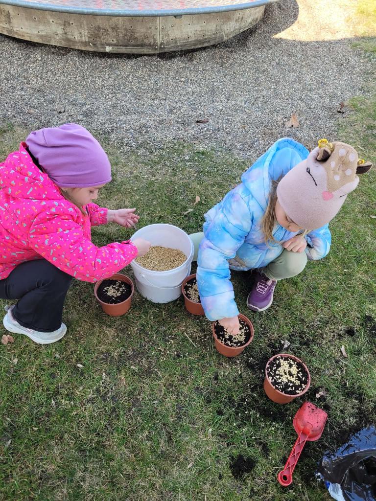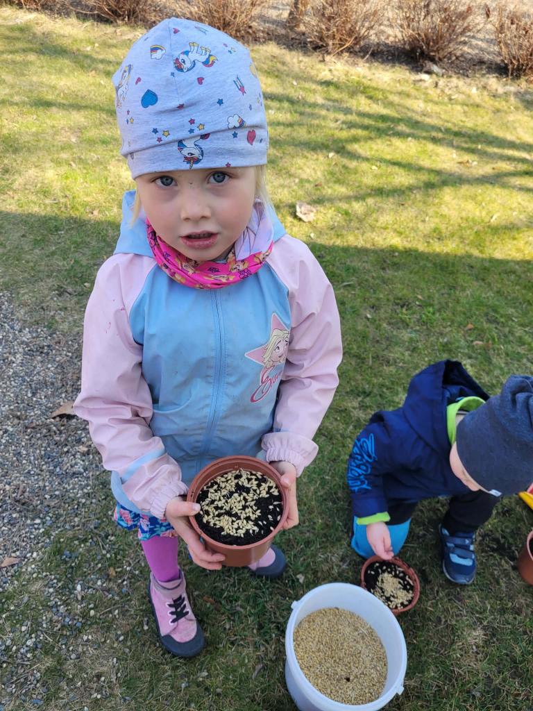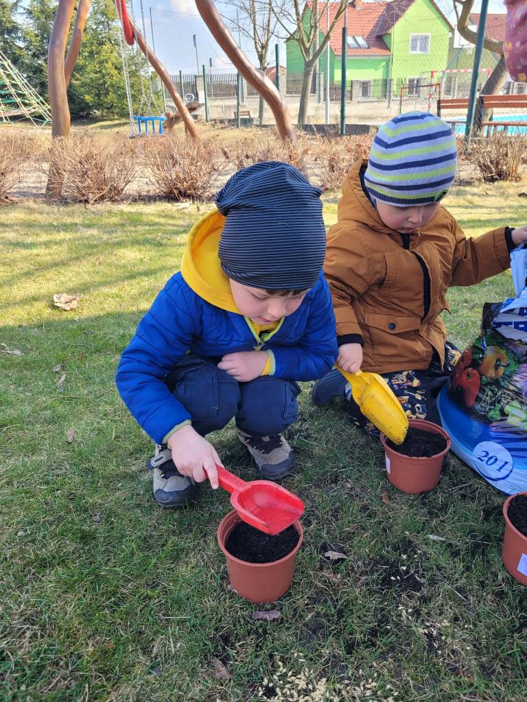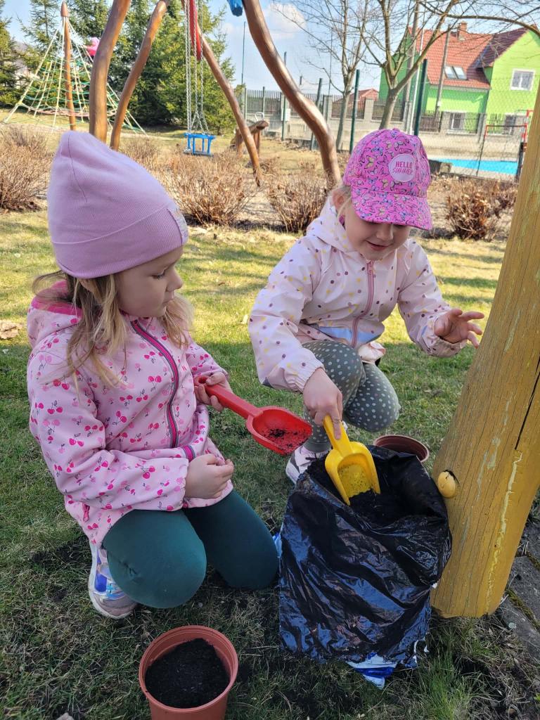 Děti si s radostí vysévají osení, poznávají jarní přírodu na vycházkách, hrají si na zahradě mateřské školy a všímají si velikonoční výzdoby v obci.