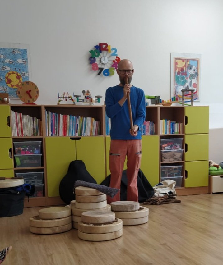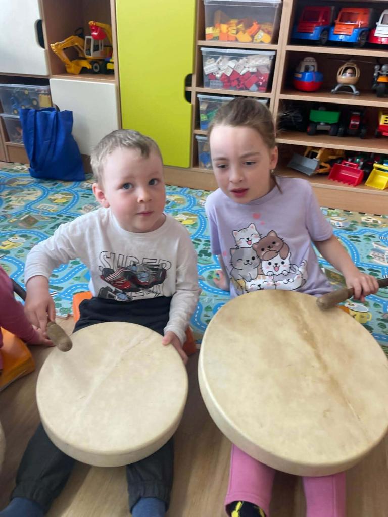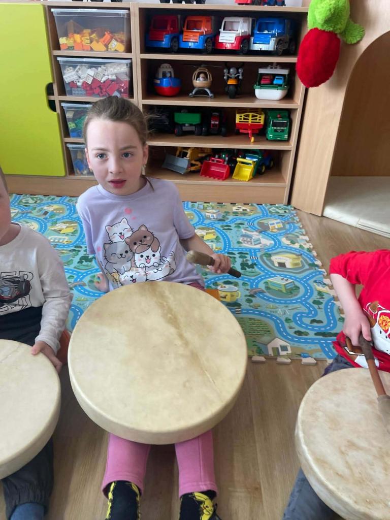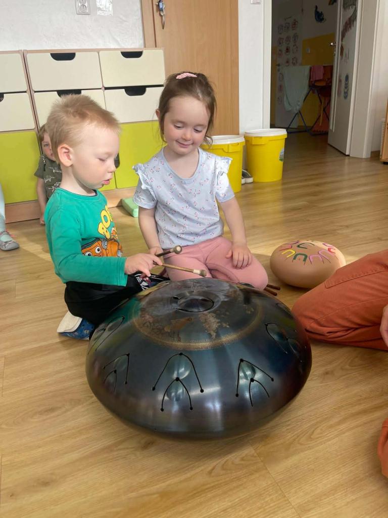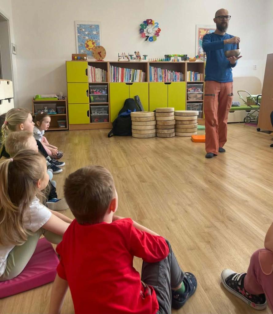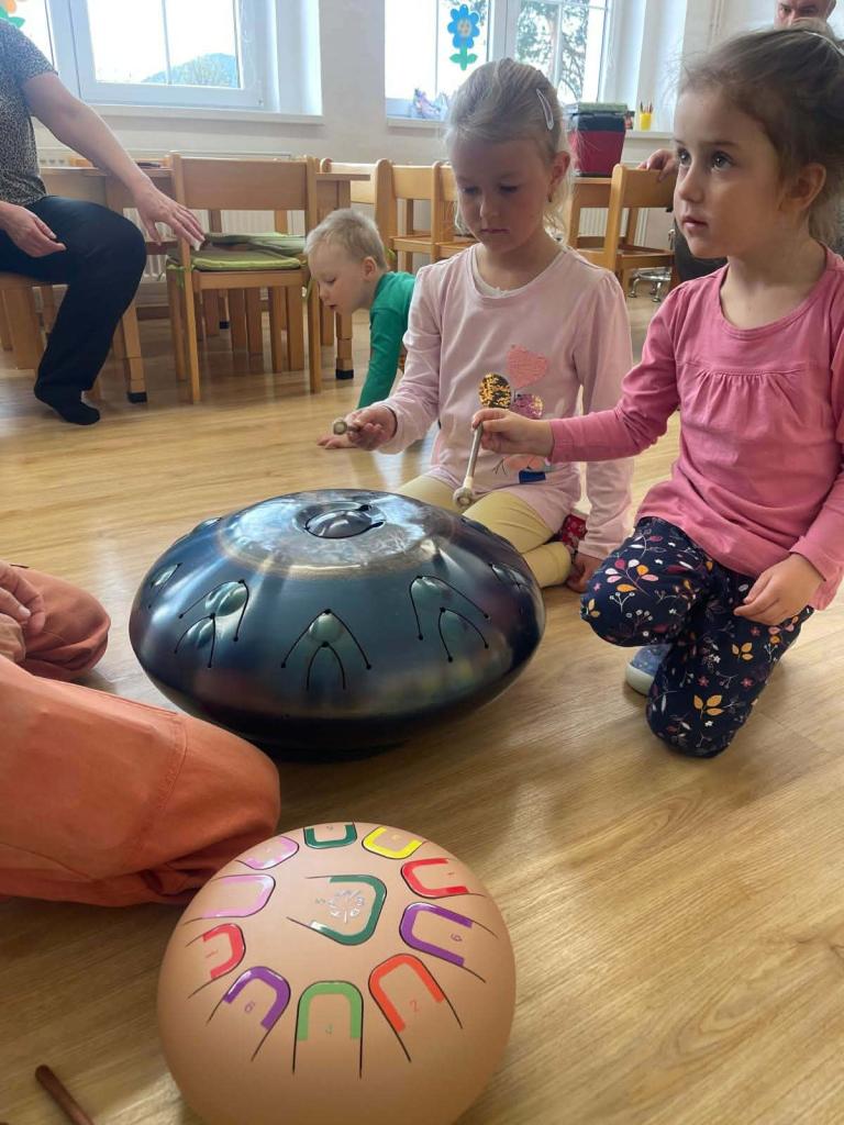 Bubnování - Za dětmi přijel lektor, který jim představil různé druhy bubínků. Děti se učily naslouchat zvukům, vnímat rytmus a udržet ho. Každý si měl možnost vyzkoušet hru na bubínek – jak prsty, tak i paličkou – a procvičit si rytmické cítění.