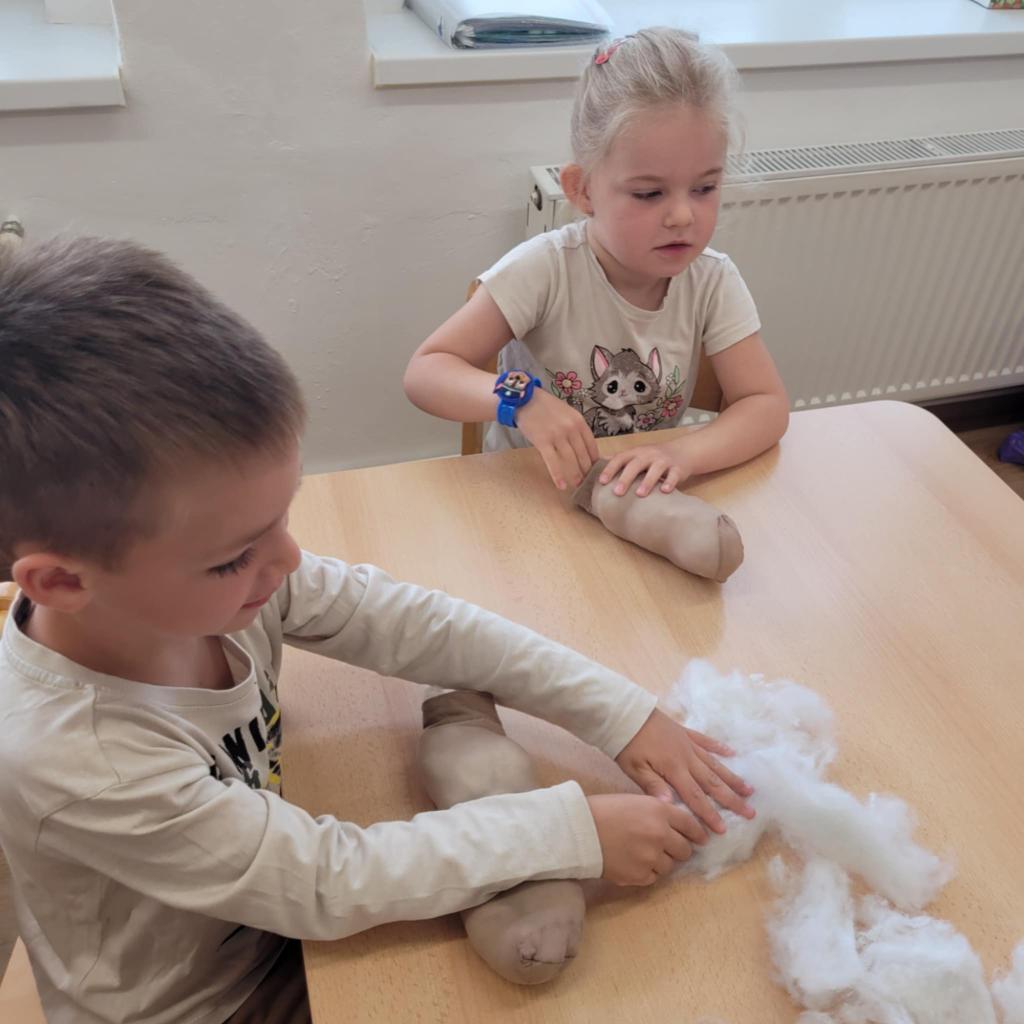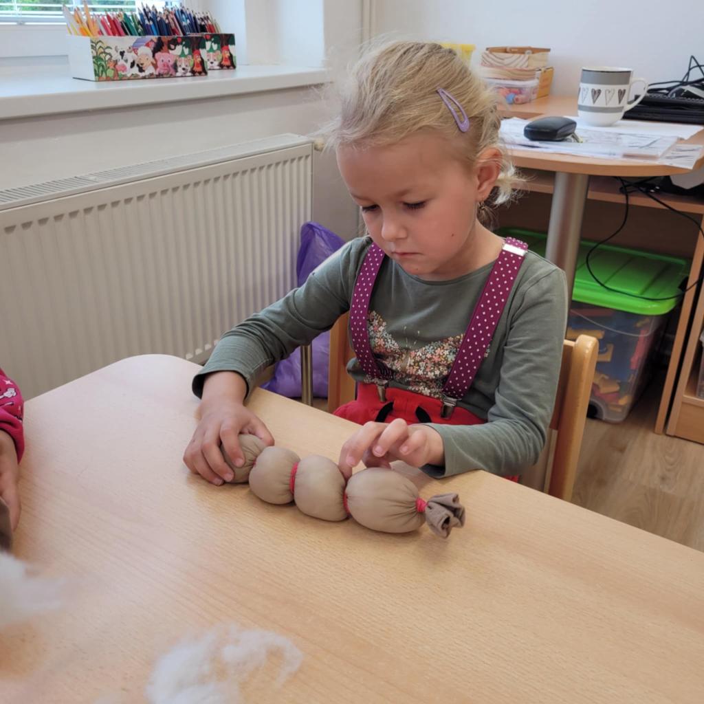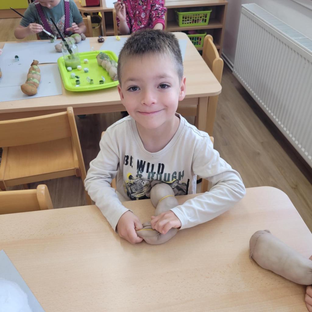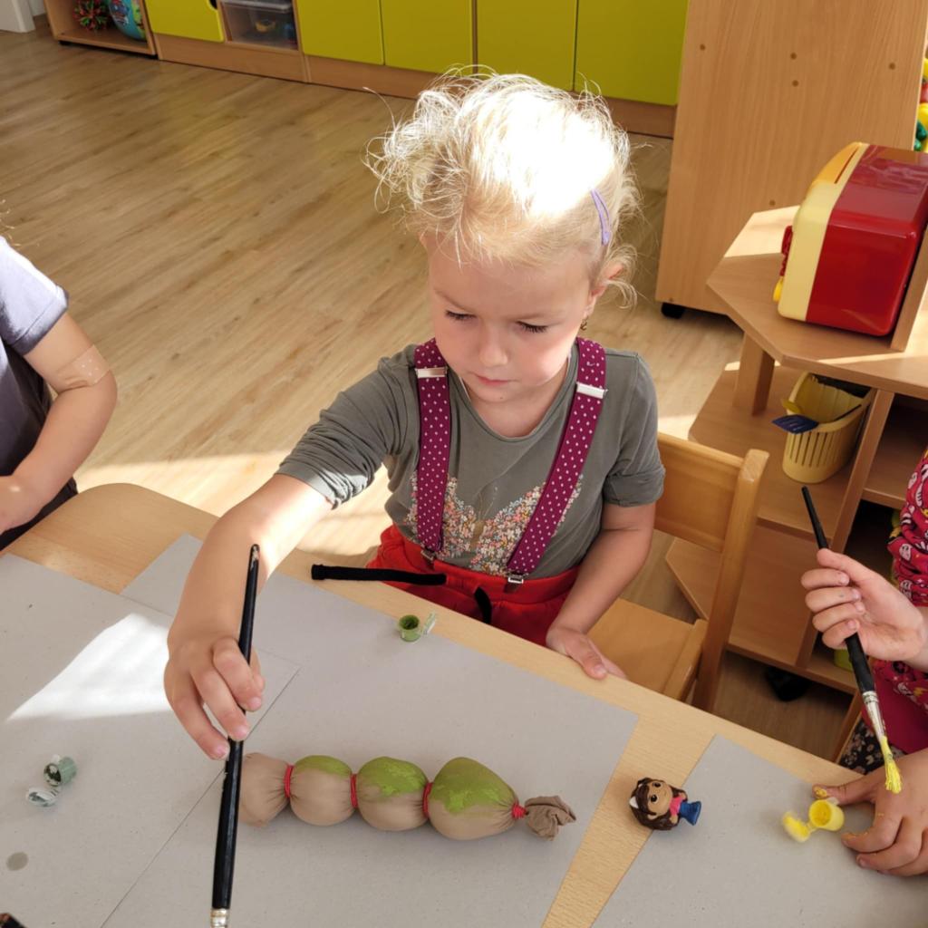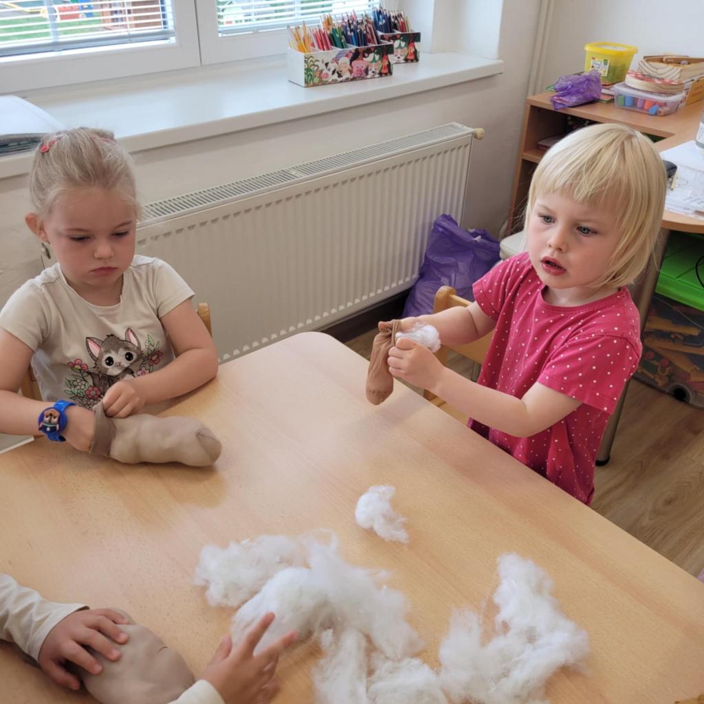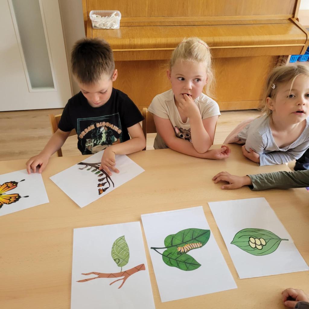 Děti pozorují hmyz v přírodě a seznamují se s cyklem motýla. Vyrábějí motýlky z ruliček a housenky z ponožek, které plní, tvarují gumičkami a tvoří jim oči. Nakonec housenky balí do papíru, aby znázornily zakuklení.