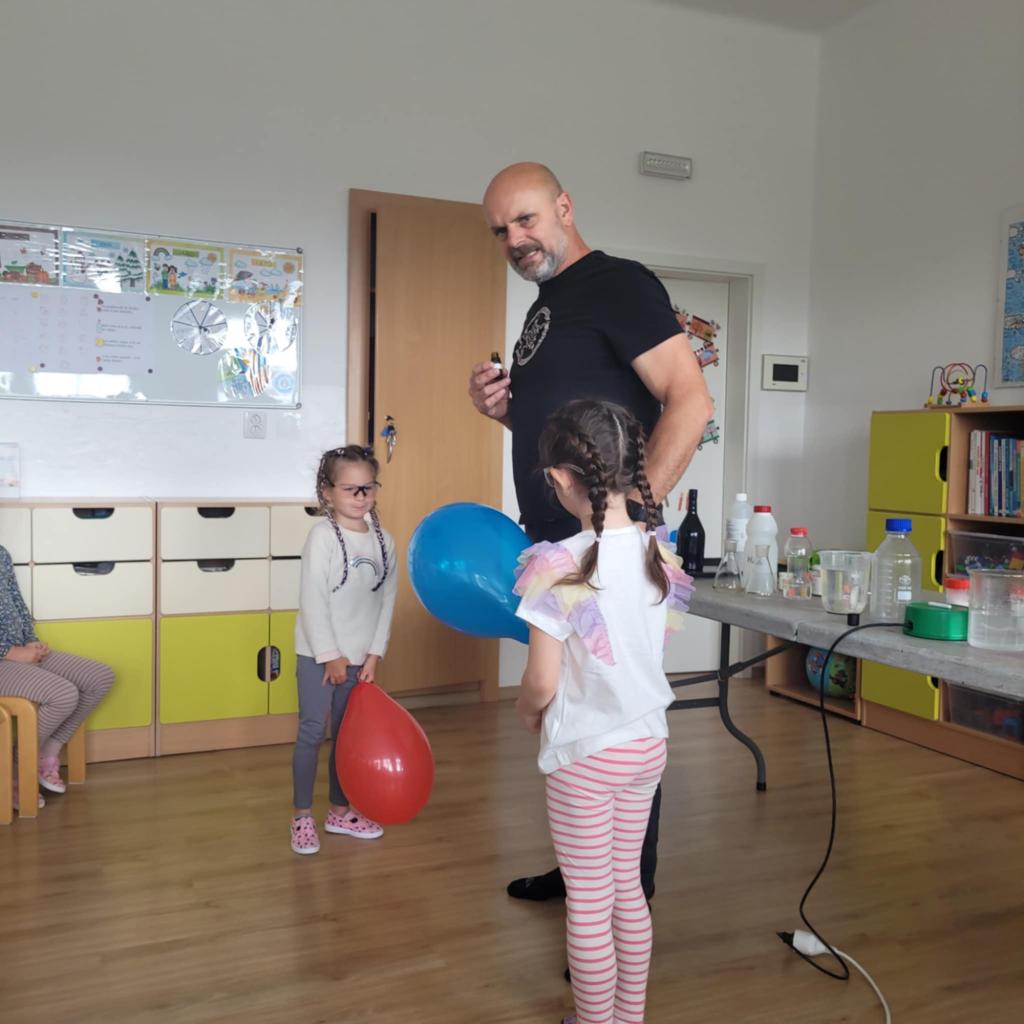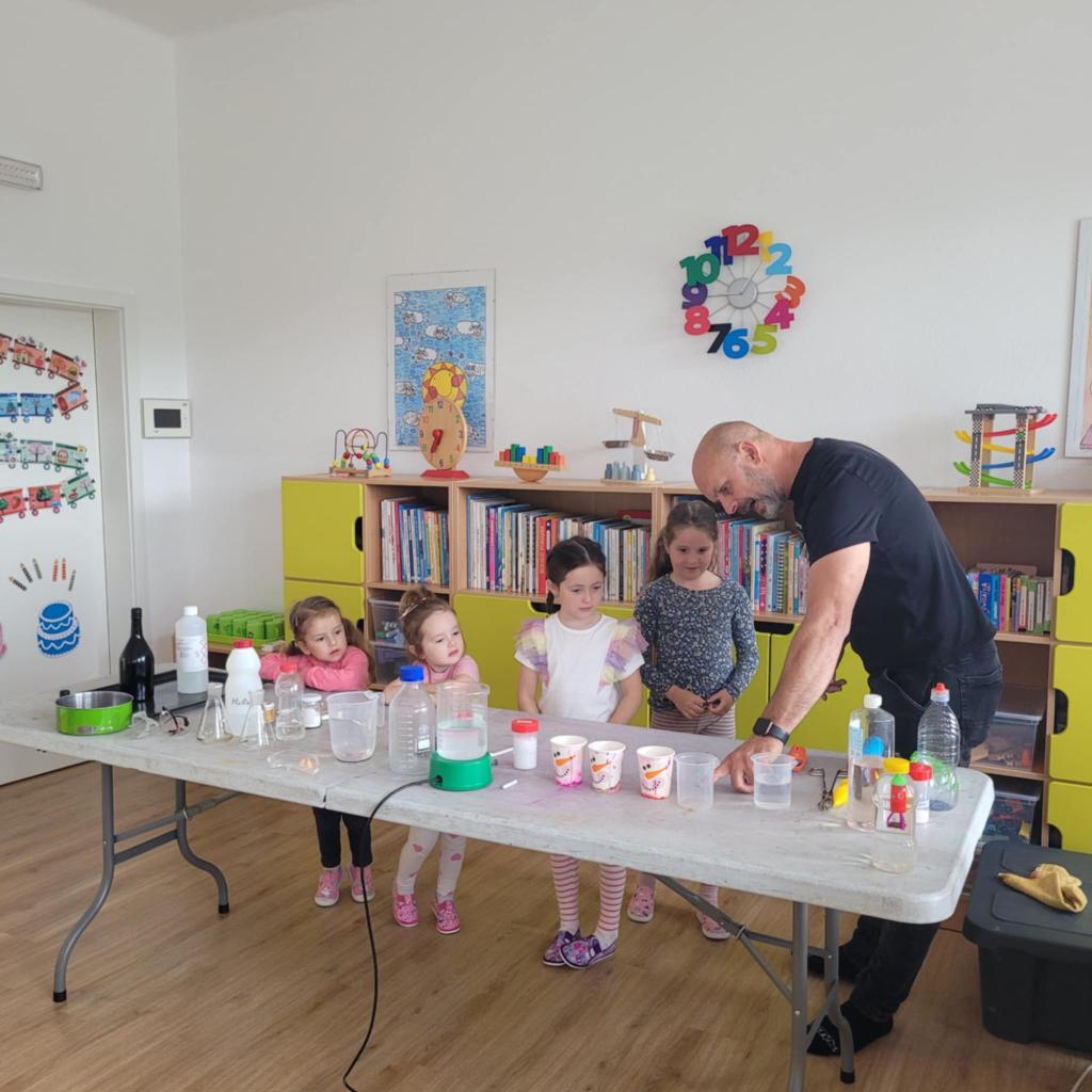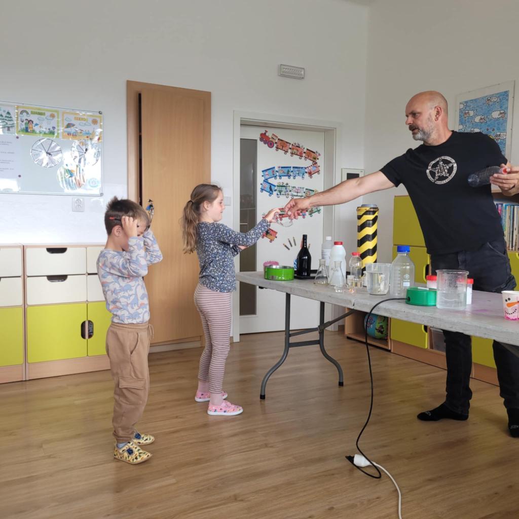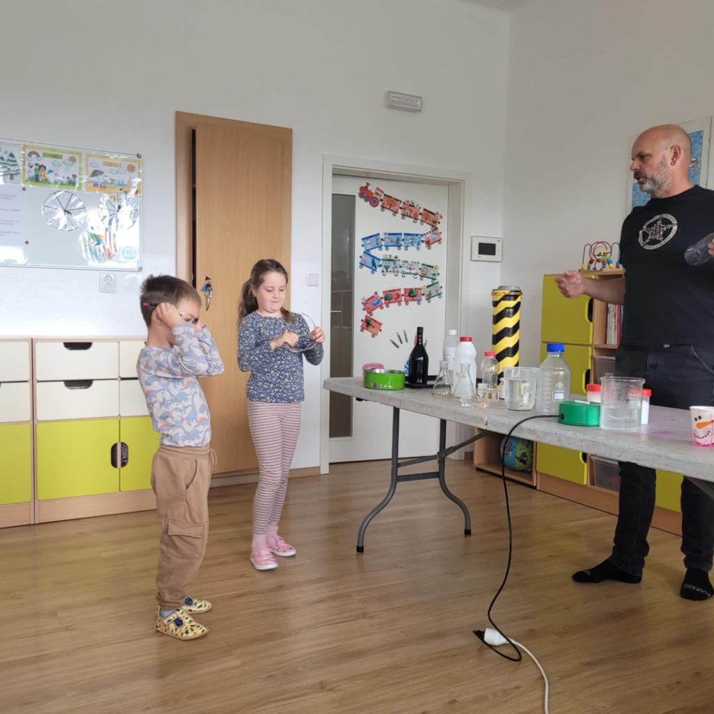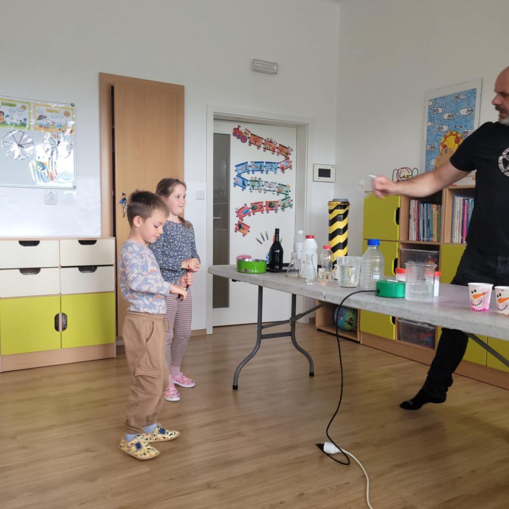 Děti v mateřské škole s nadšením sledovaly vědeckou show plnou zábavných pokusů. Obdivovaly měnící se barvy, páru i bublající směsi. Některé pokusy si samy vyzkoušely a objevování je moc bavilo.