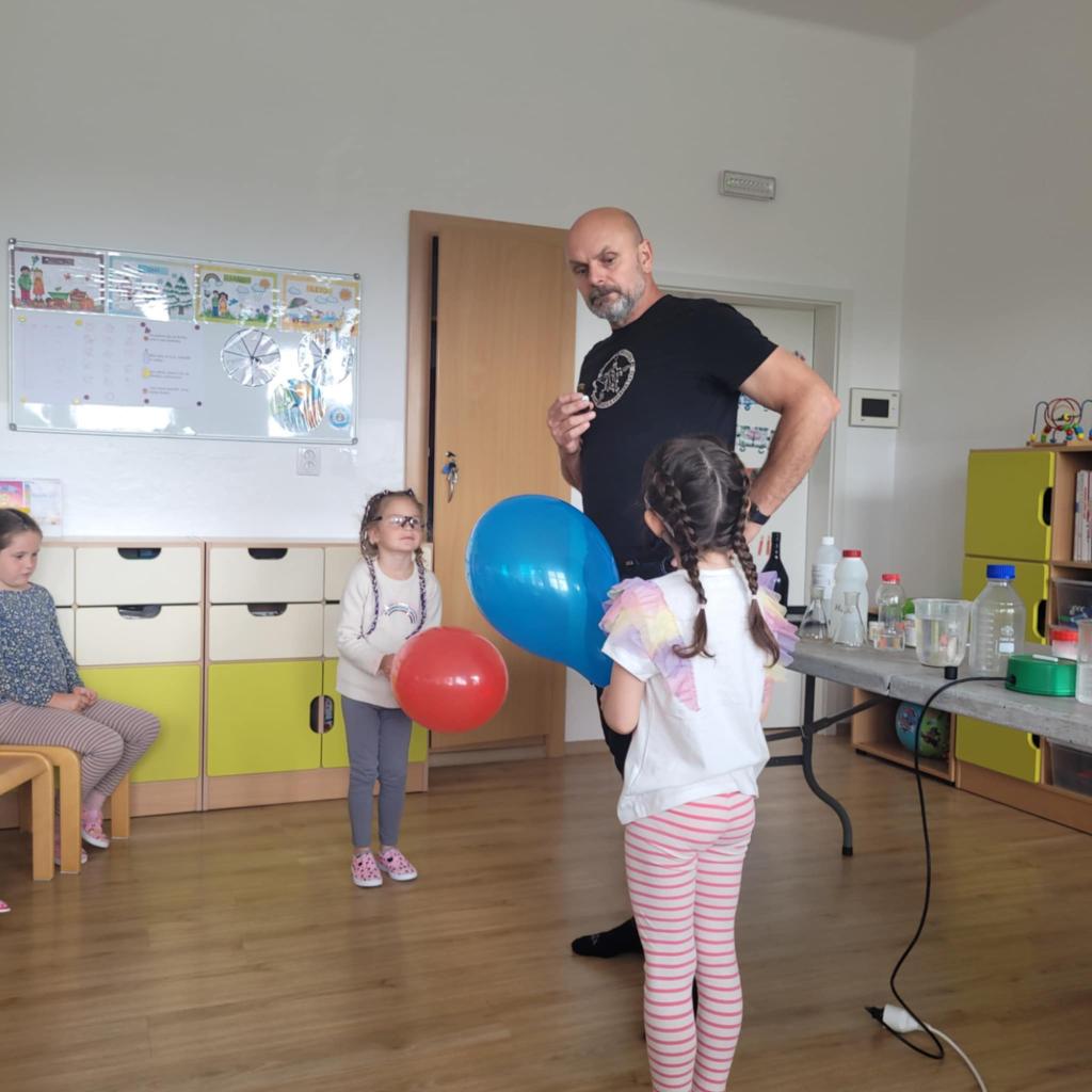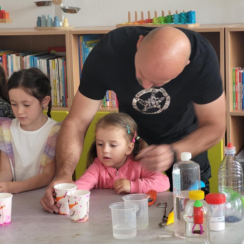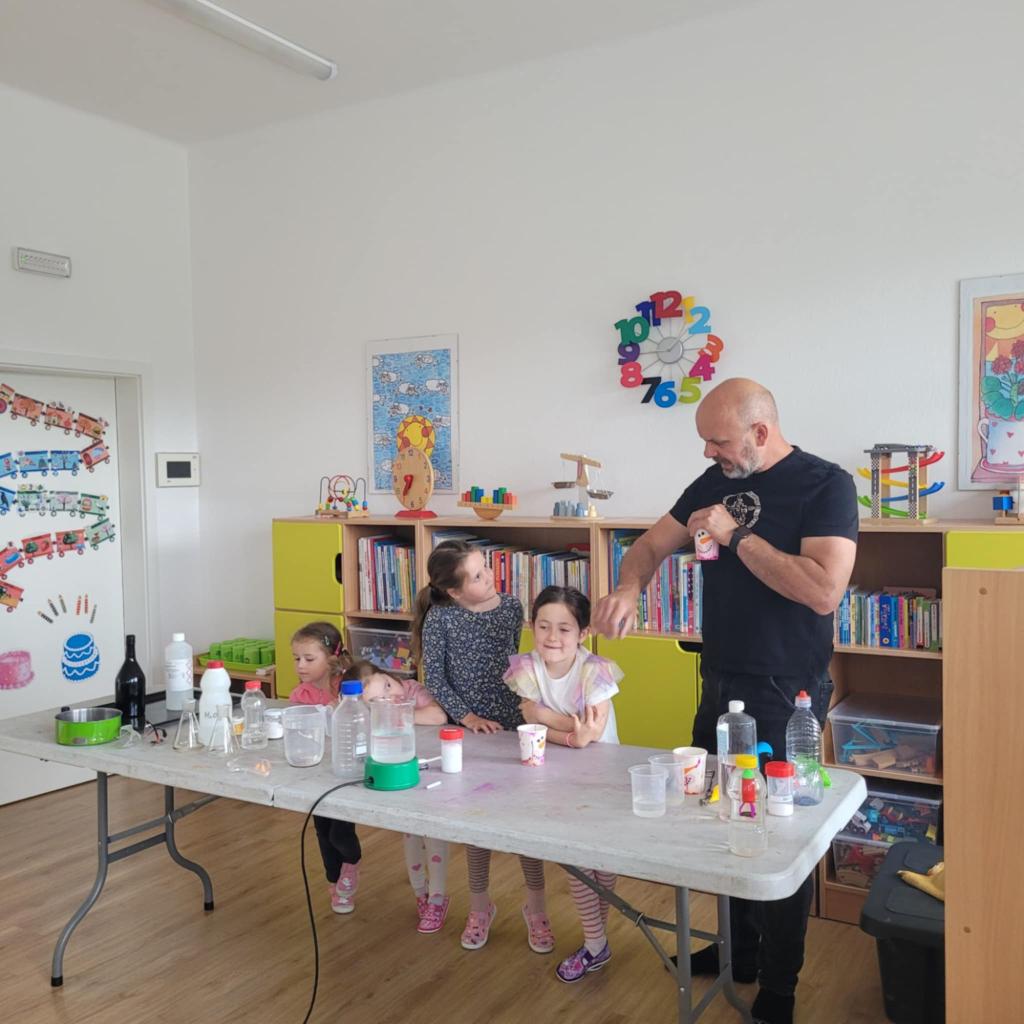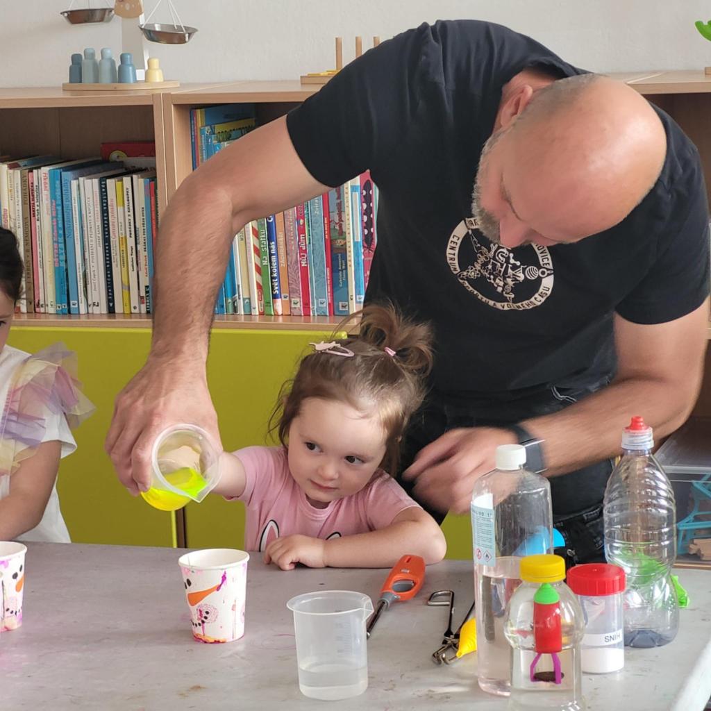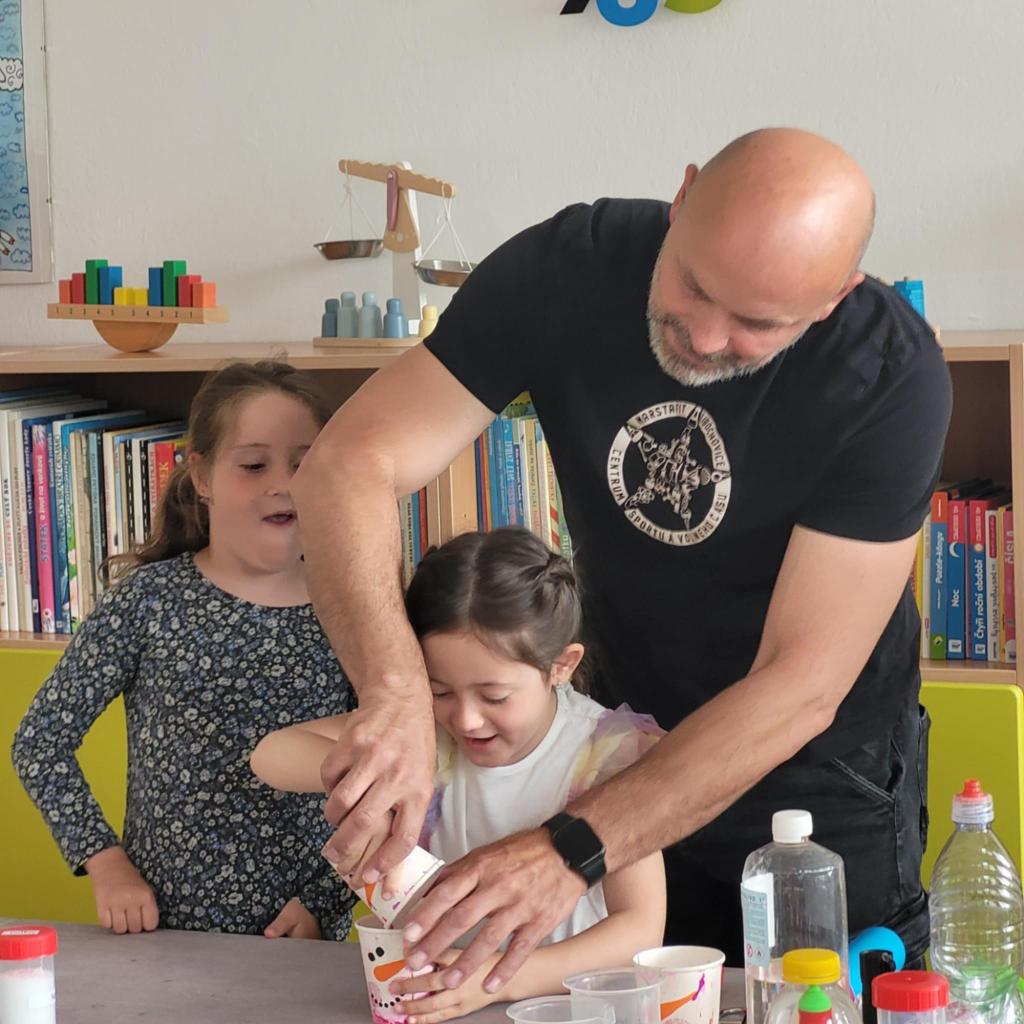 Děti v mateřské škole s nadšením sledovaly vědeckou show plnou zábavných pokusů. Obdivovaly měnící se barvy, páru i bublající směsi. Některé pokusy si samy vyzkoušely a objevování je moc bavilo.