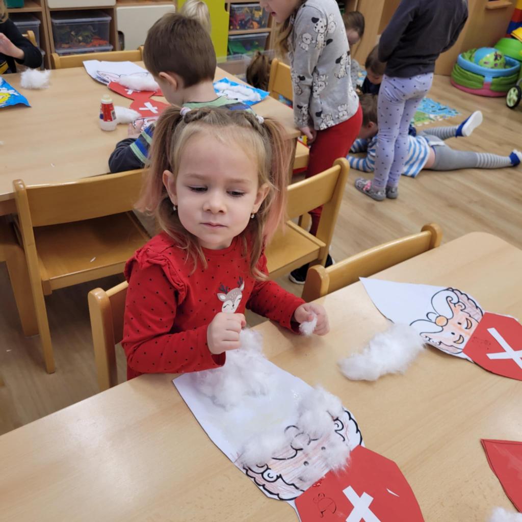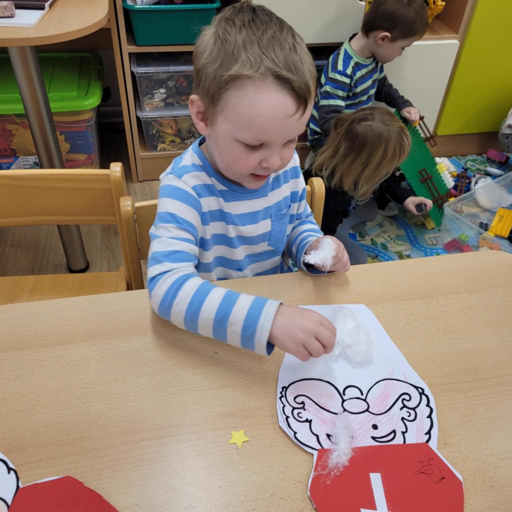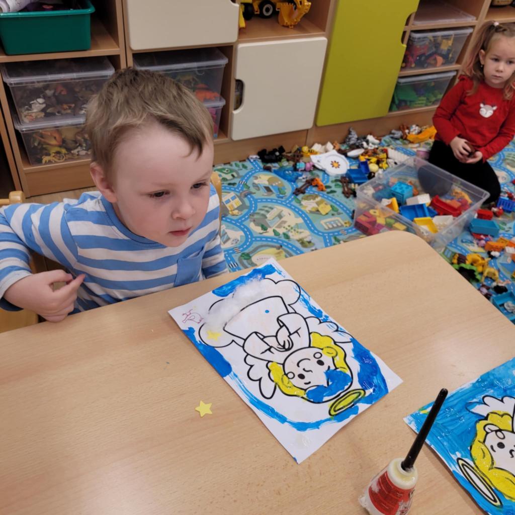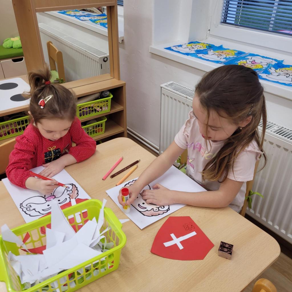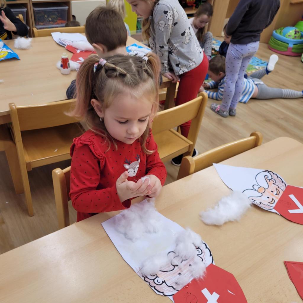 Děti tvořily čerty pomocí senzorické techniky "malování do kávy" - prstíky kreslily do nasypané a vodou pokapané rozpustné kávy. Vybarvovaly také Mikuláše i anděla a na obláčky a vousy lepily vatu. Při práci rozvíjely jemnou motoriku, tvořivost a trpělivost.