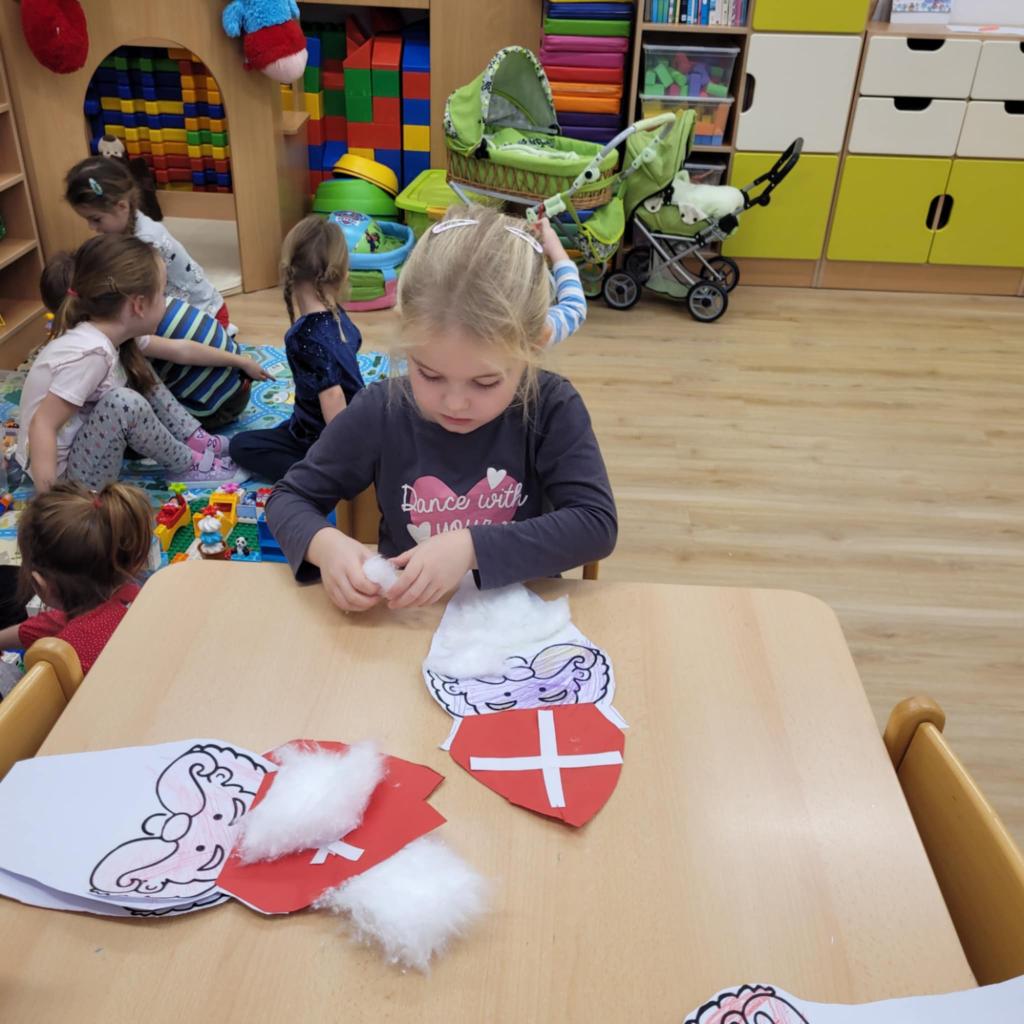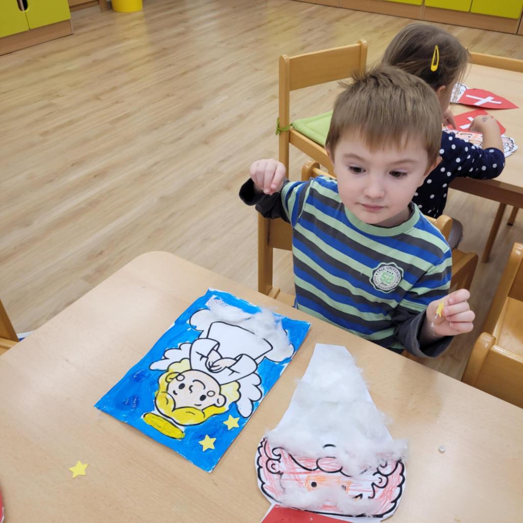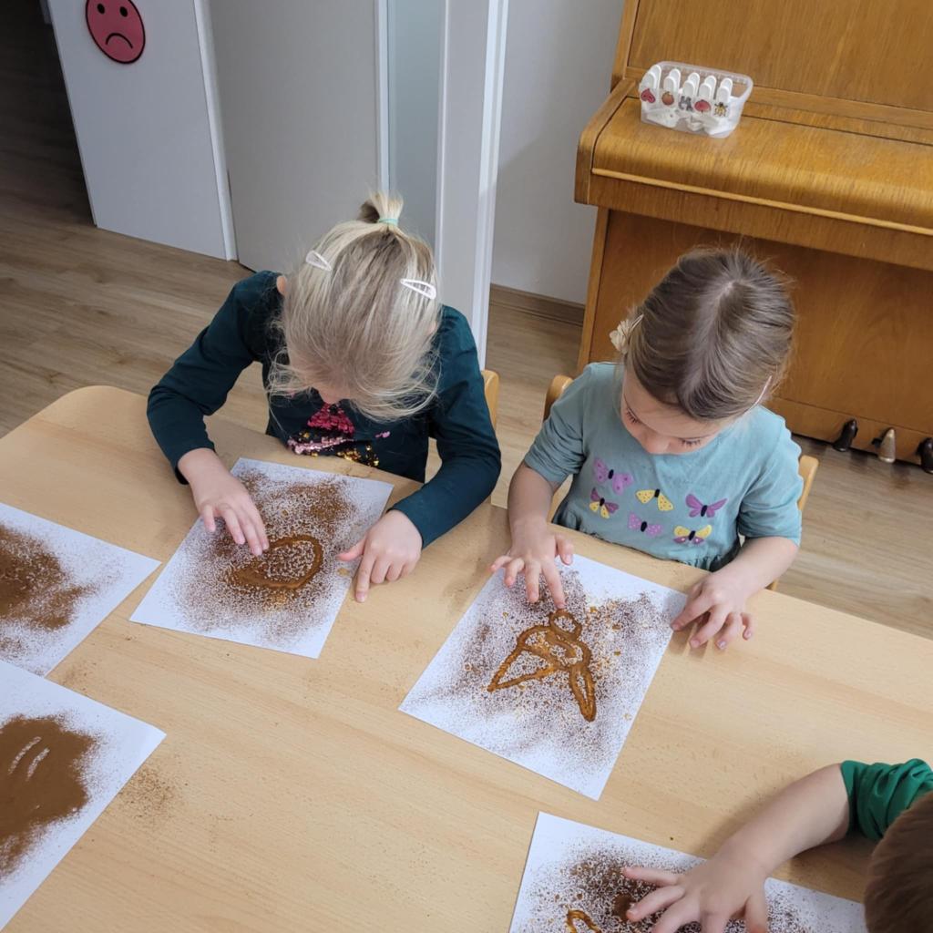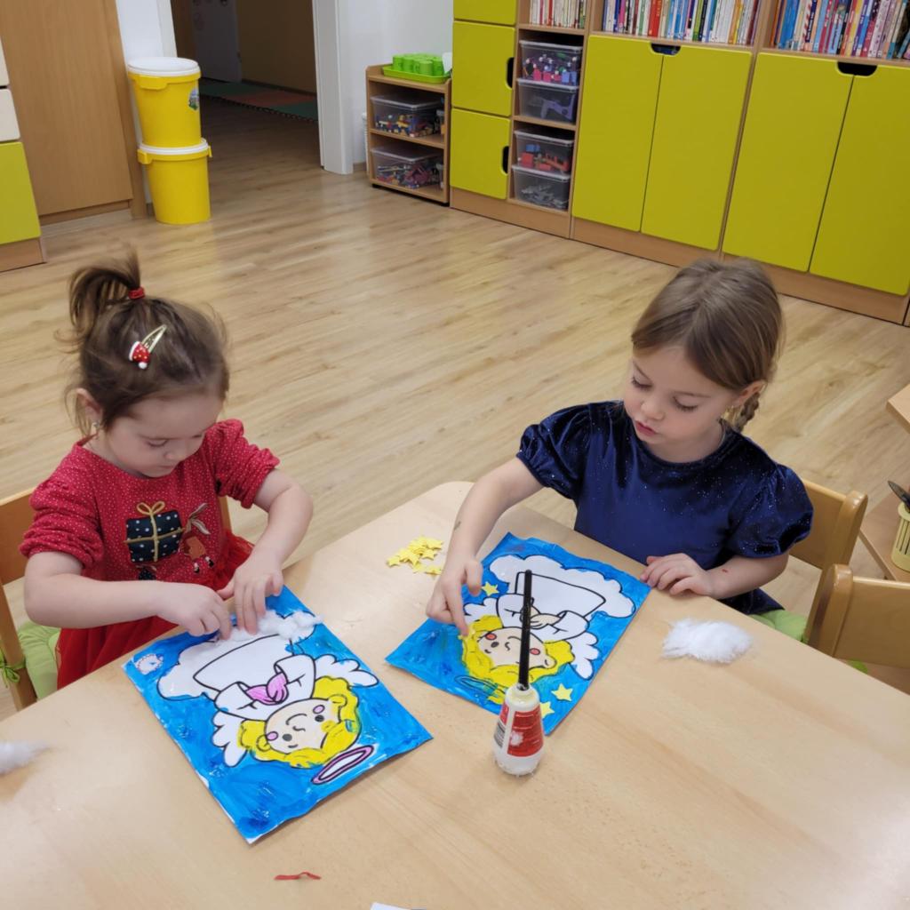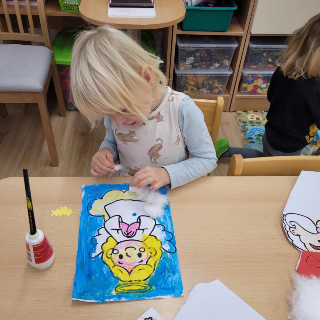 Děti tvořily čerty pomocí senzorické techniky "malování do kávy" - prstíky kreslily do nasypané a vodou pokapané rozpustné kávy. Vybarvovaly také Mikuláše i anděla a na obláčky a vousy lepily vatu. Při práci rozvíjely jemnou motoriku, tvořivost a trpělivost.