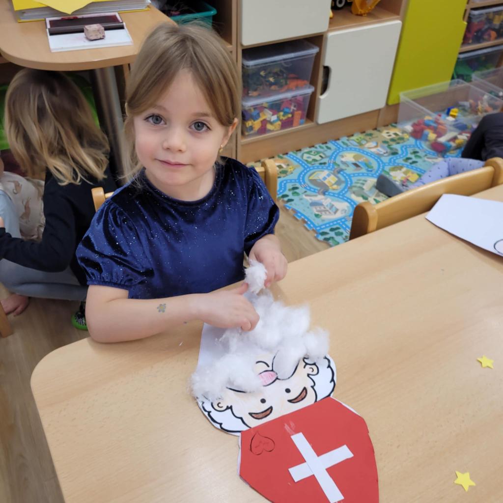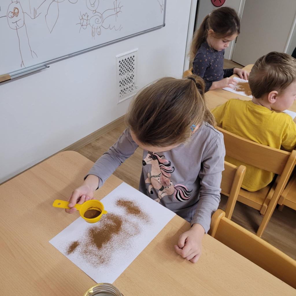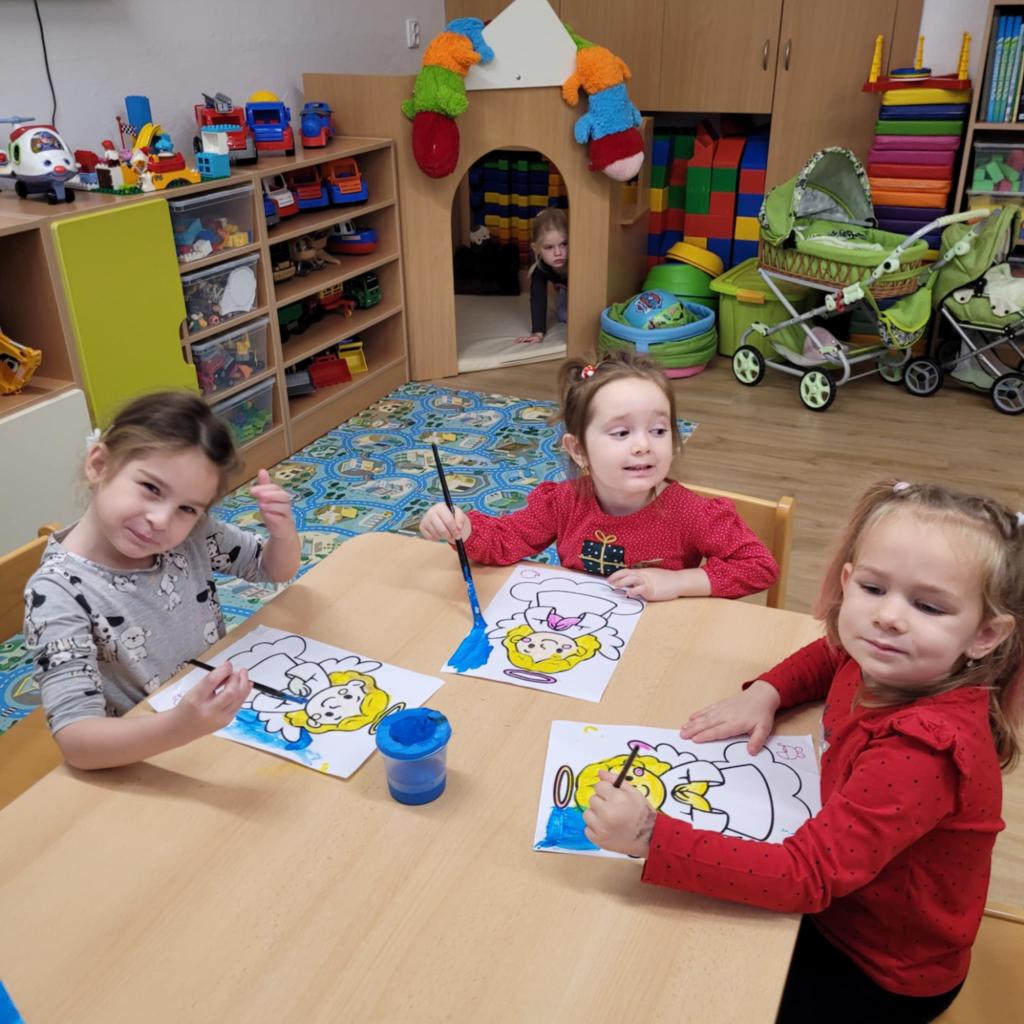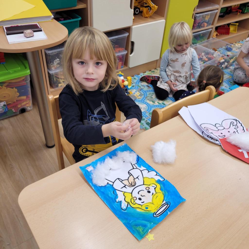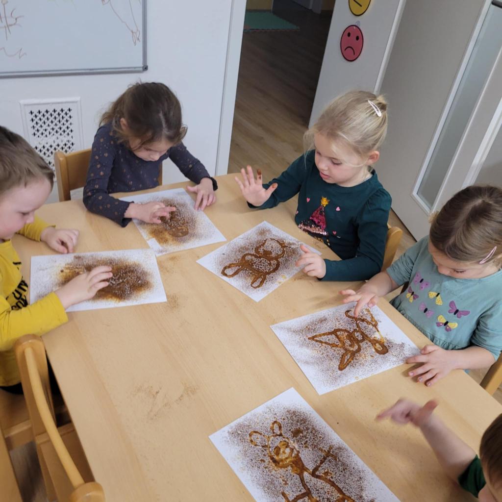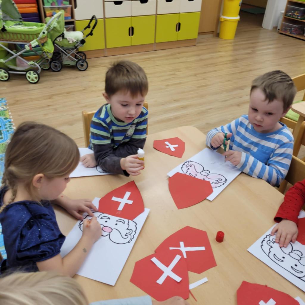 Děti tvořily čerty pomocí senzorické techniky "malování do kávy" - prstíky kreslily do nasypané a vodou pokapané rozpustné kávy. Vybarvovaly také Mikuláše i anděla a na obláčky a vousy lepily vatu. Při práci rozvíjely jemnou motoriku, tvořivost a trpělivost.