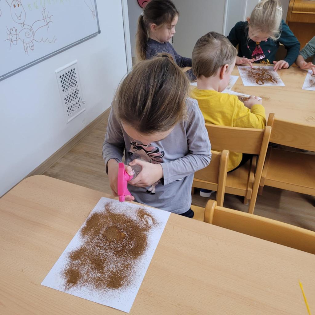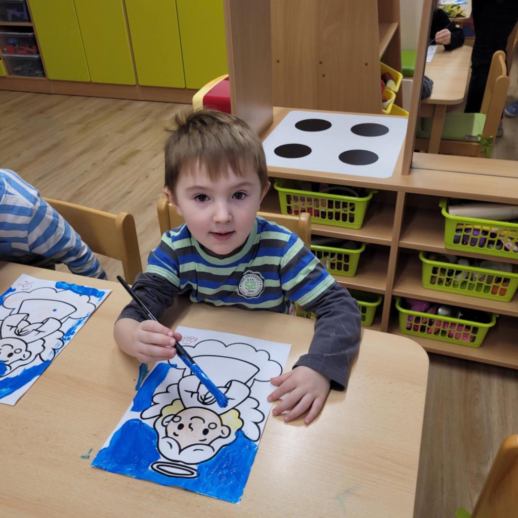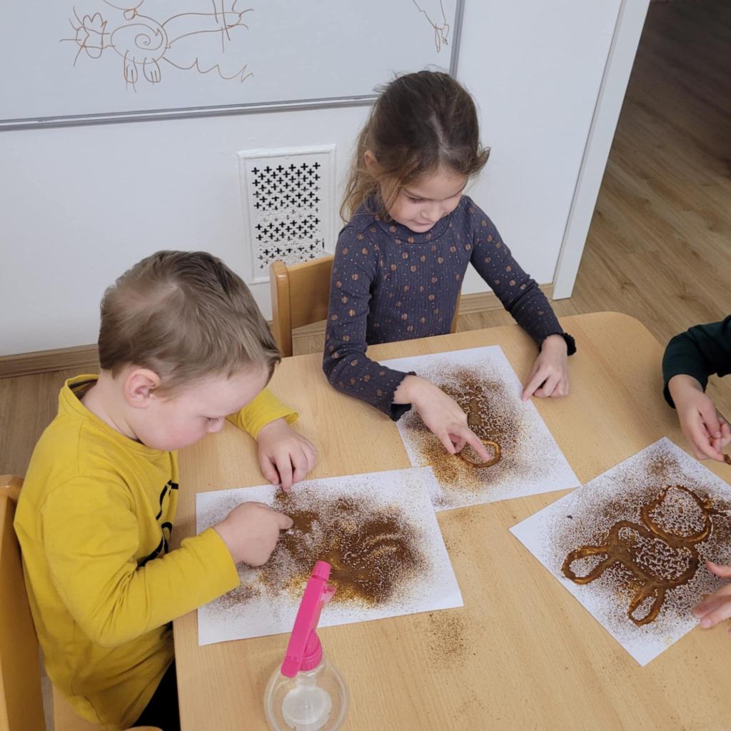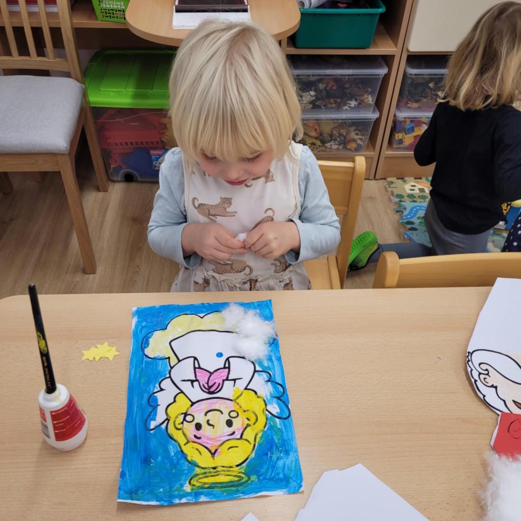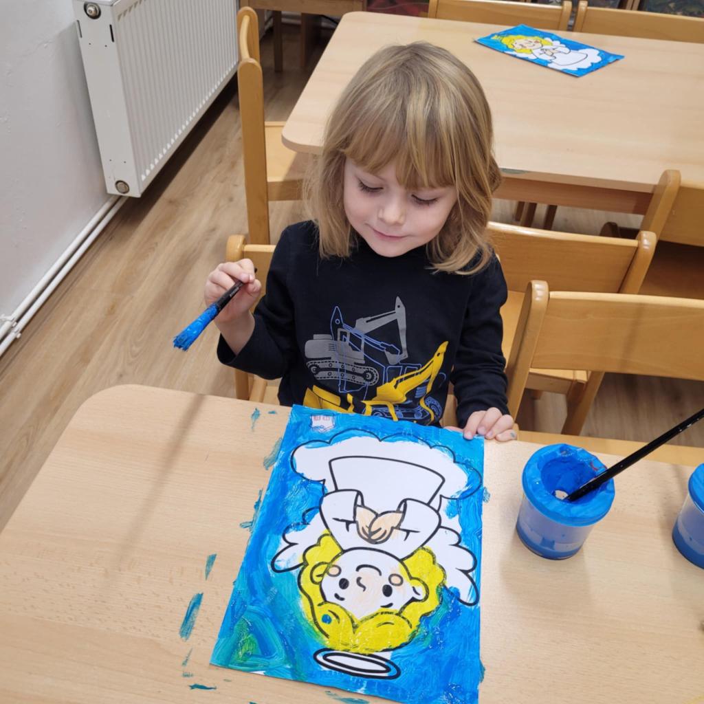 Děti tvořily čerty pomocí senzorické techniky "malování do kávy" - prstíky kreslily do nasypané a vodou pokapané rozpustné kávy. Vybarvovaly také Mikuláše i anděla a na obláčky a vousy lepily vatu. Při práci rozvíjely jemnou motoriku, tvořivost a trpělivost.