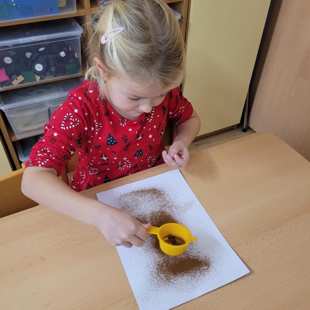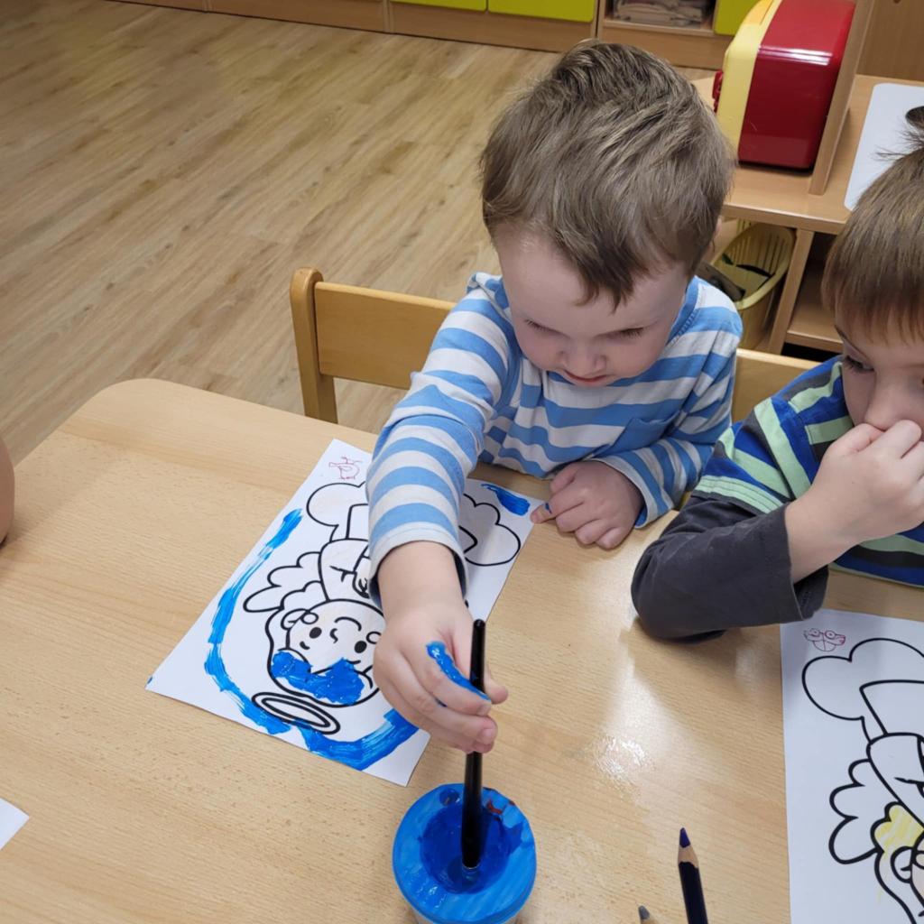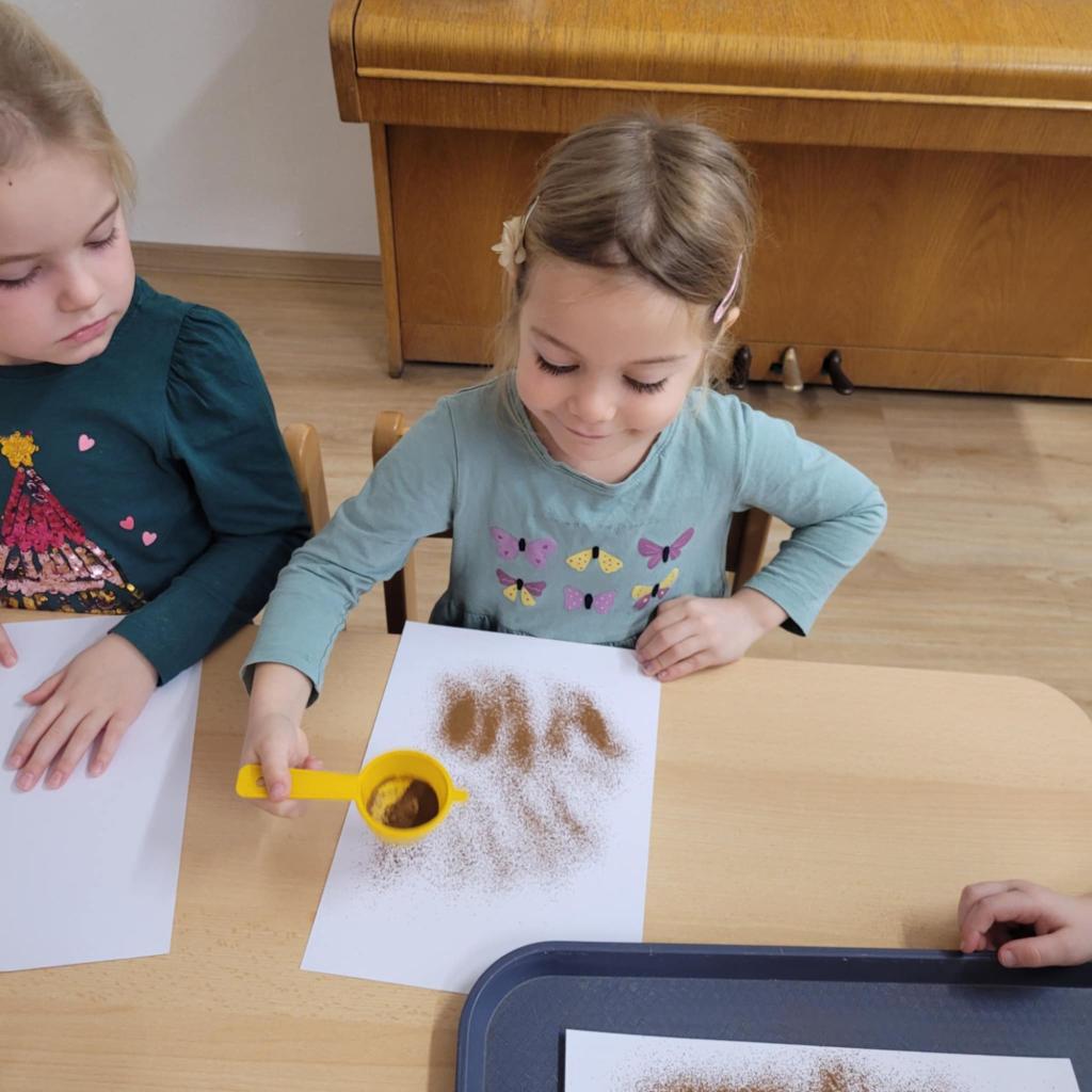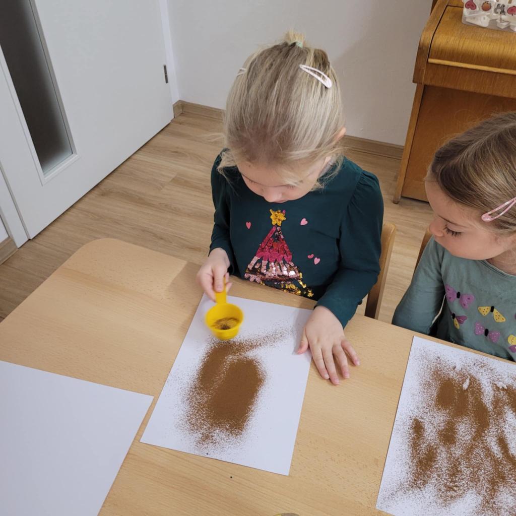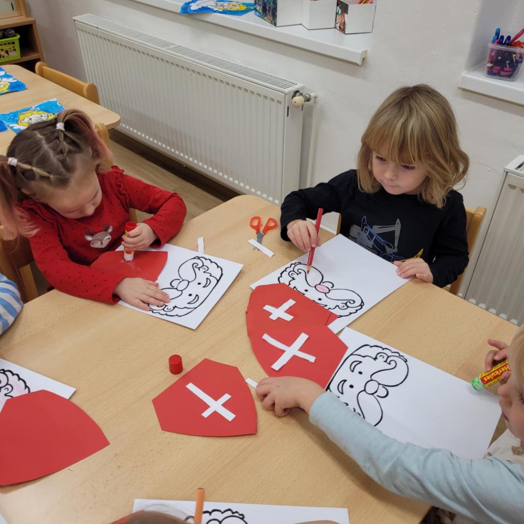 Děti tvořily čerty pomocí senzorické techniky "malování do kávy" - prstíky kreslily do nasypané a vodou pokapané rozpustné kávy. Vybarvovaly také Mikuláše i anděla a na obláčky a vousy lepily vatu. Při práci rozvíjely jemnou motoriku, tvořivost a trpělivost.