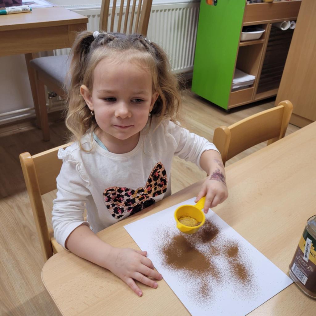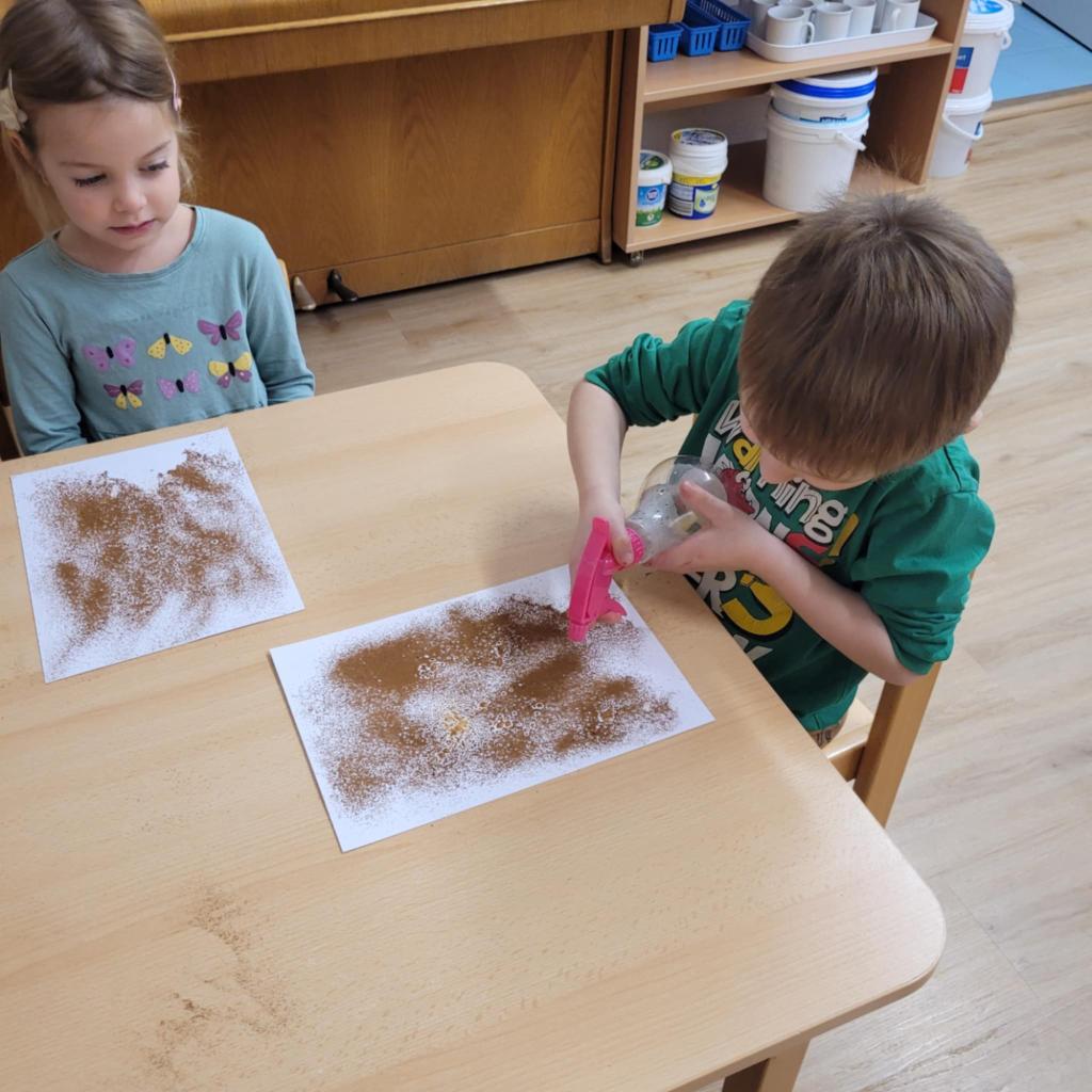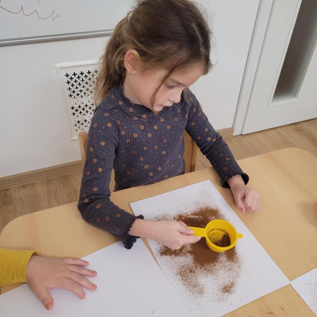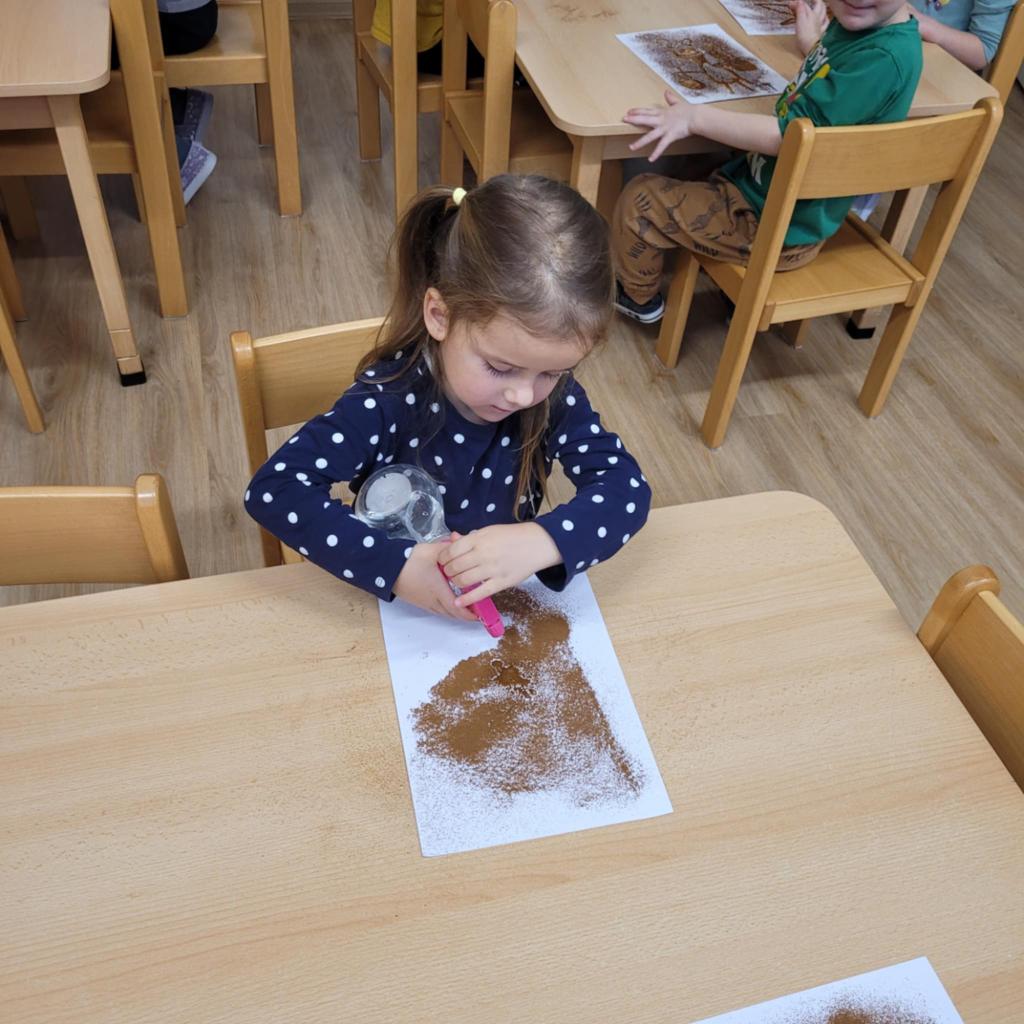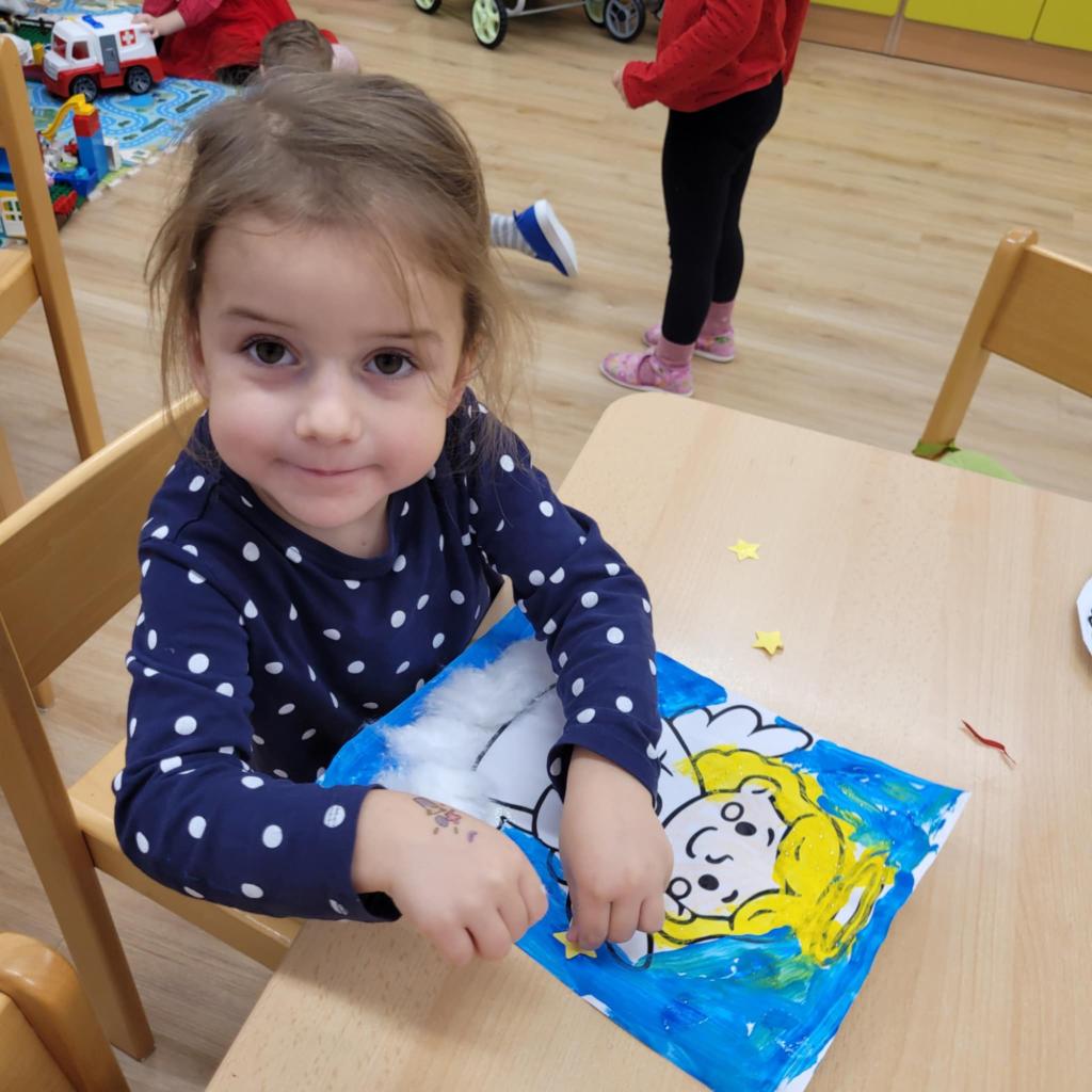Děti tvořily čerty pomocí senzorické techniky "malování do kávy" - prstíky kreslily do nasypané a vodou pokapané rozpustné kávy. Vybarvovaly také Mikuláše i anděla a na obláčky a vousy lepily vatu. Při práci rozvíjely jemnou motoriku, tvořivost a trpělivost.