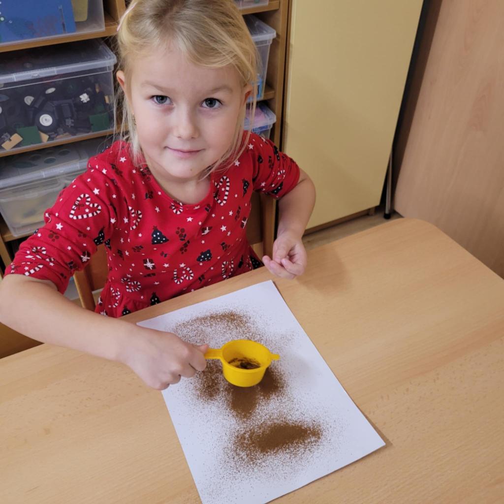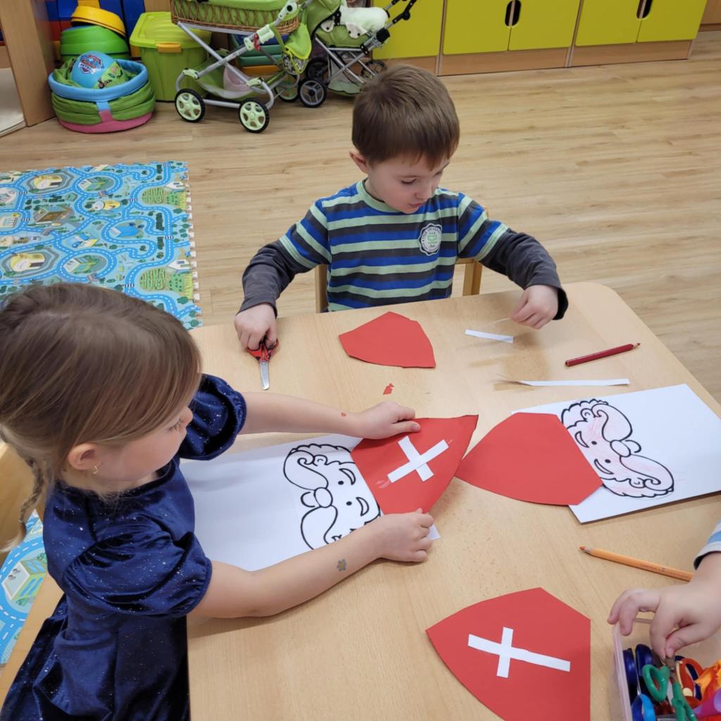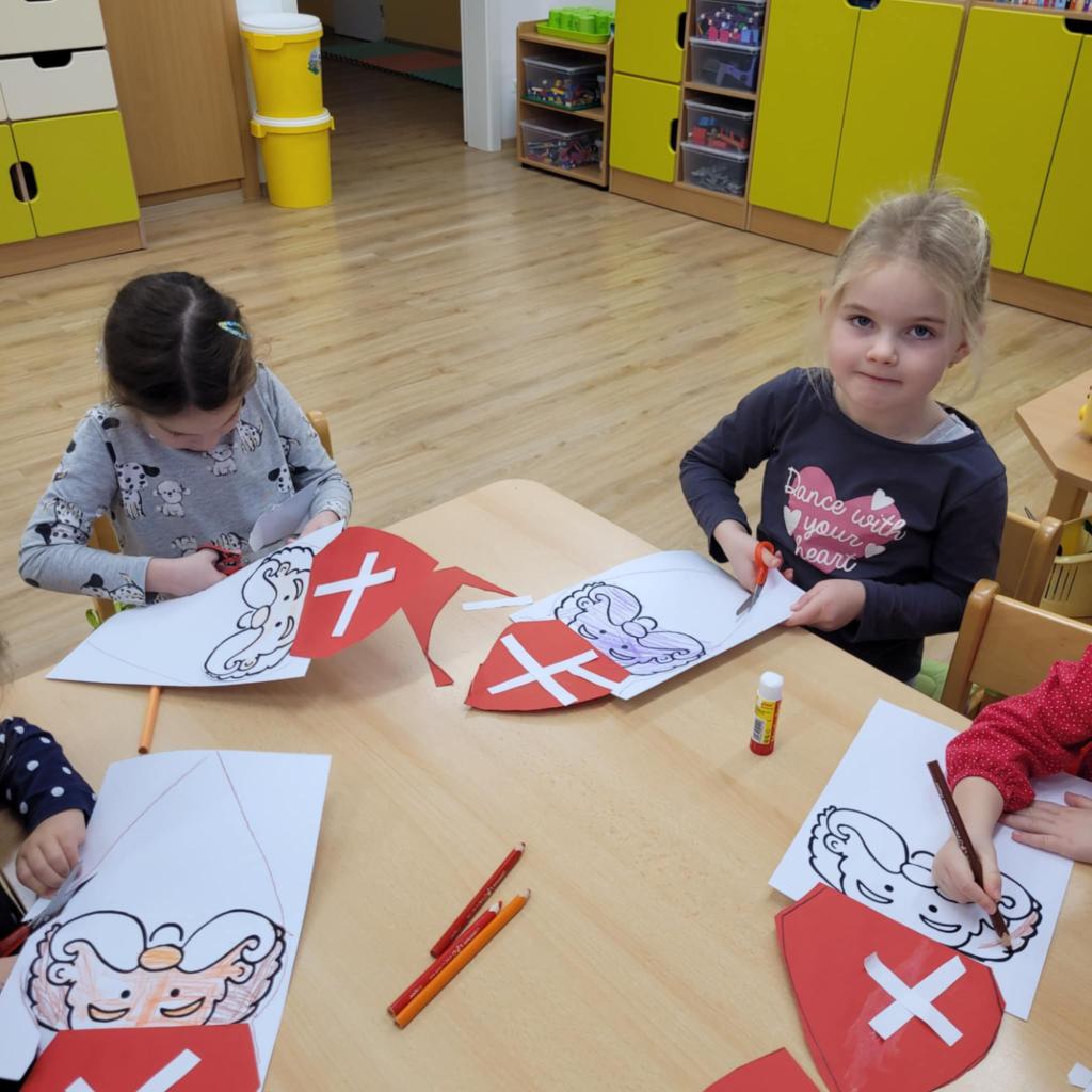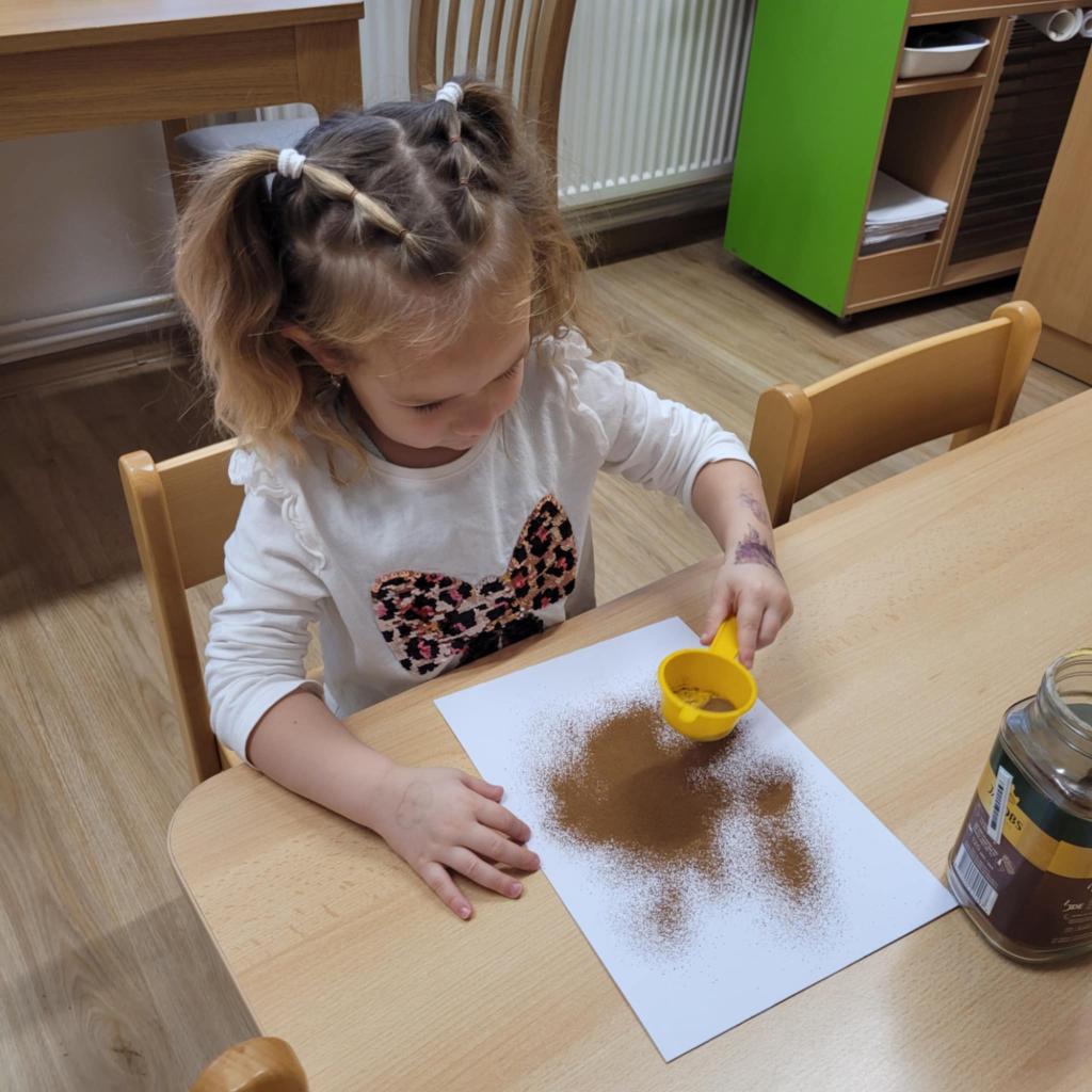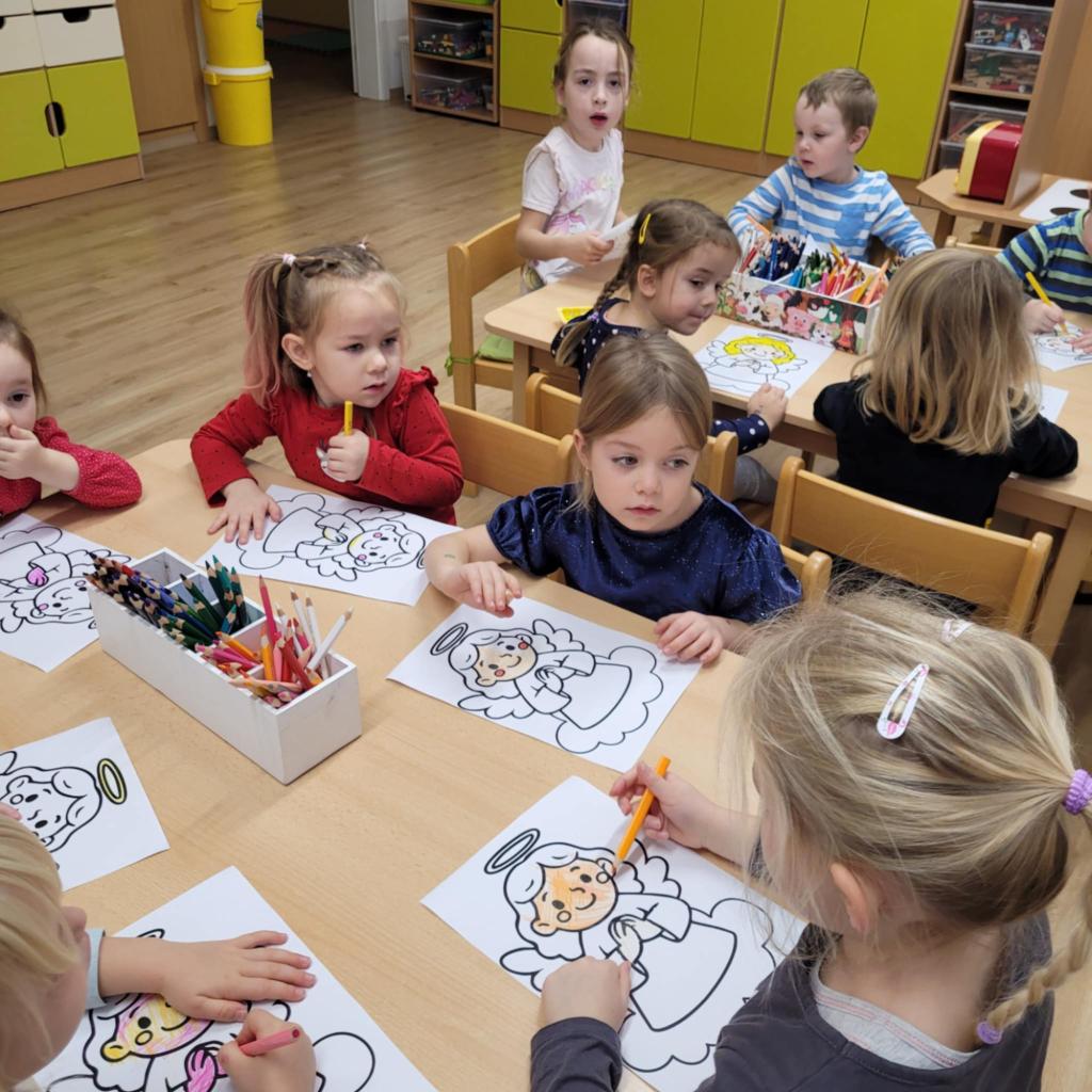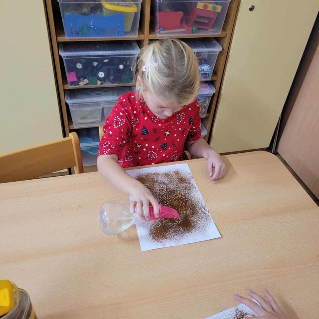 Děti tvořily čerty pomocí senzorické techniky "malování do kávy" - prstíky kreslily do nasypané a vodou pokapané rozpustné kávy. Vybarvovaly také Mikuláše i anděla a na obláčky a vousy lepily vatu. Při práci rozvíjely jemnou motoriku, tvořivost a trpělivost.