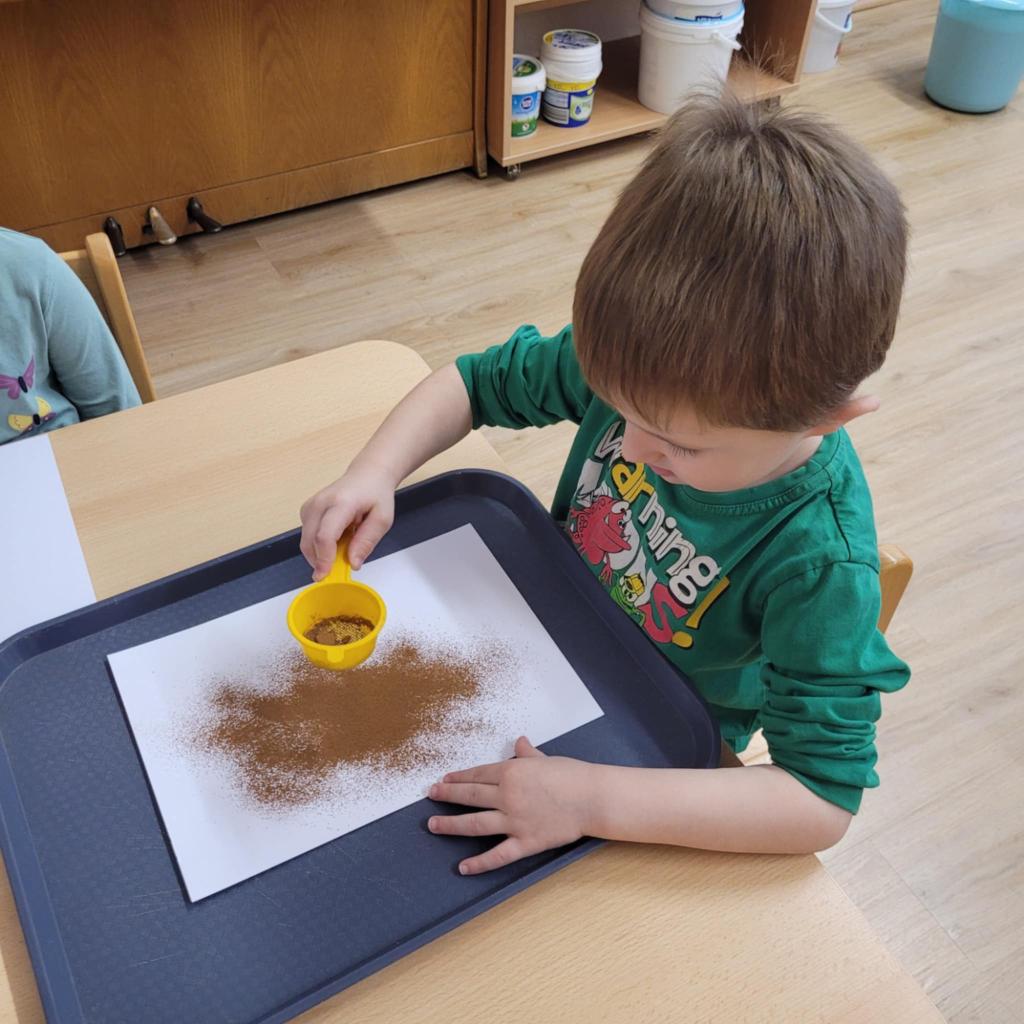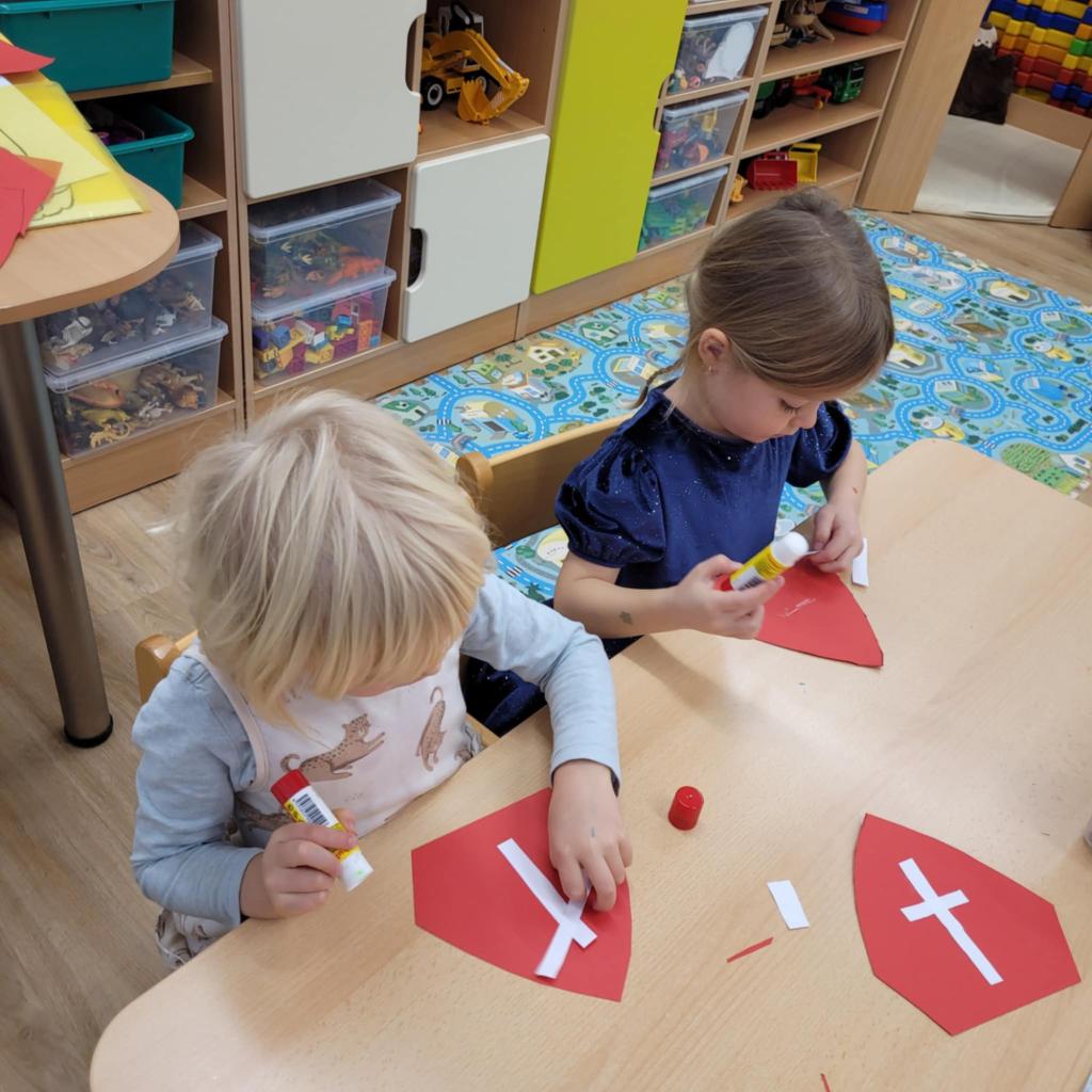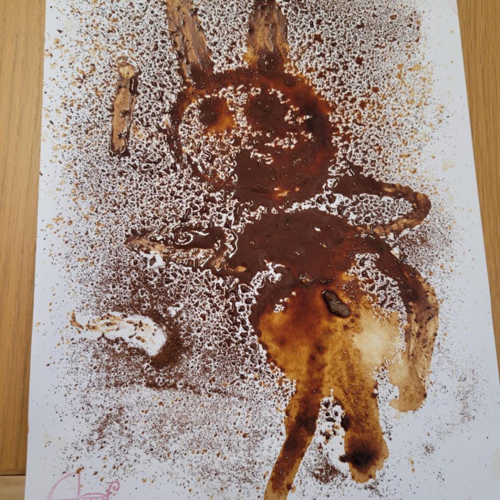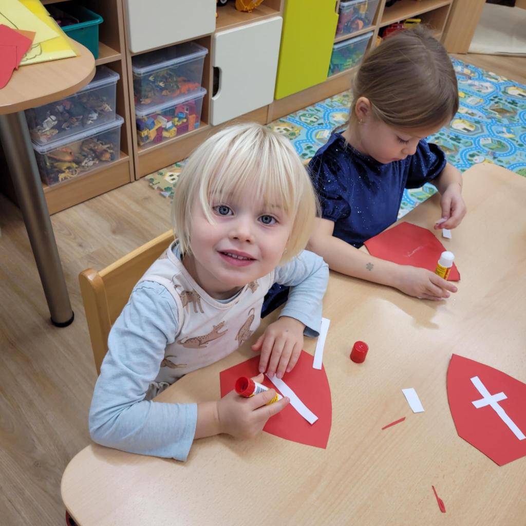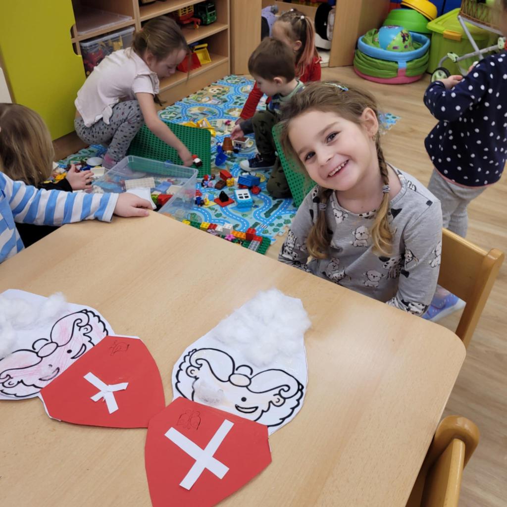 Děti tvořily čerty pomocí senzorické techniky "malování do kávy" - prstíky kreslily do nasypané a vodou pokapané rozpustné kávy. Vybarvovaly také Mikuláše i anděla a na obláčky a vousy lepily vatu. Při práci rozvíjely jemnou motoriku, tvořivost a trpělivost.